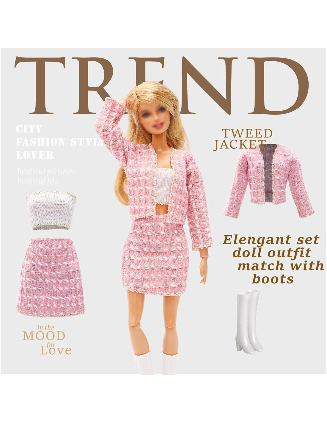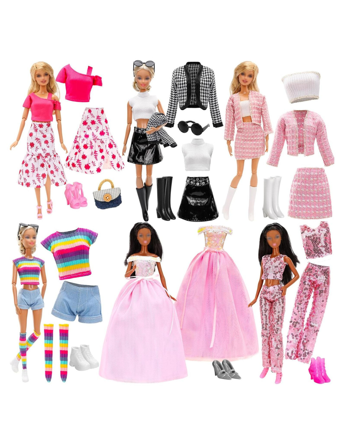 - [15 Piezas de Ropa y Accesorios para Muñecas] Estas muñecas de 11.5 pulgadas ofrecen 6 divertidos conjuntos de ropa y accesorios para 6 looks completos. Incluye 2 conjuntos de trajes de tweed, 1 vestido de fiesta, 1 conjunto de top y pantalón con brillos, 1 top y falda floral, 1 top y pantalones cortos, 2 pares de botas, 3 pares de zapatos de tacón alto, 1 par de zapatillas, 1 gafas, 1 bolso, 1 par de calcetas hasta la rodilla, tu hijo puede vestir a su muñeca con el estilo que le guste.