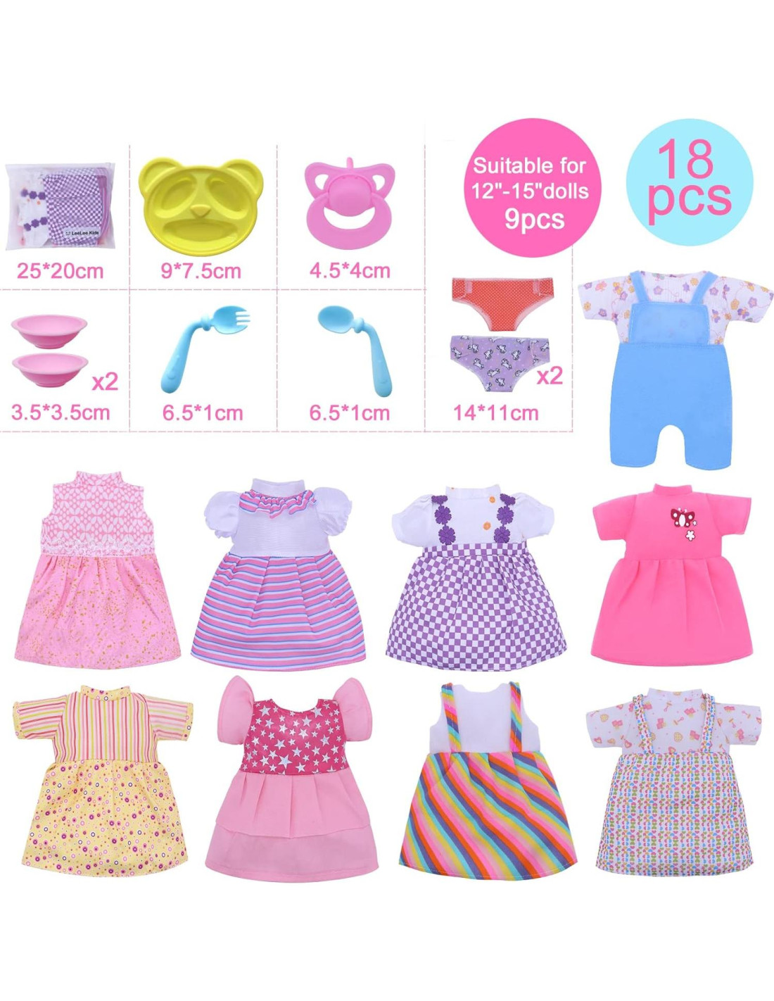 - Ropa y Accesorios de Muñecas Incluye: 9*Vestidos de Muñeca, 2*Pañales Diferentes de Muñeca, 1*Pezón, 1*tenedor, 1*cuchara, 1*plato, 2*cuencos pequeños y 1*bolsa con cremallera. LAS MUÑECAS NO ESTÁN INCLUIDAS