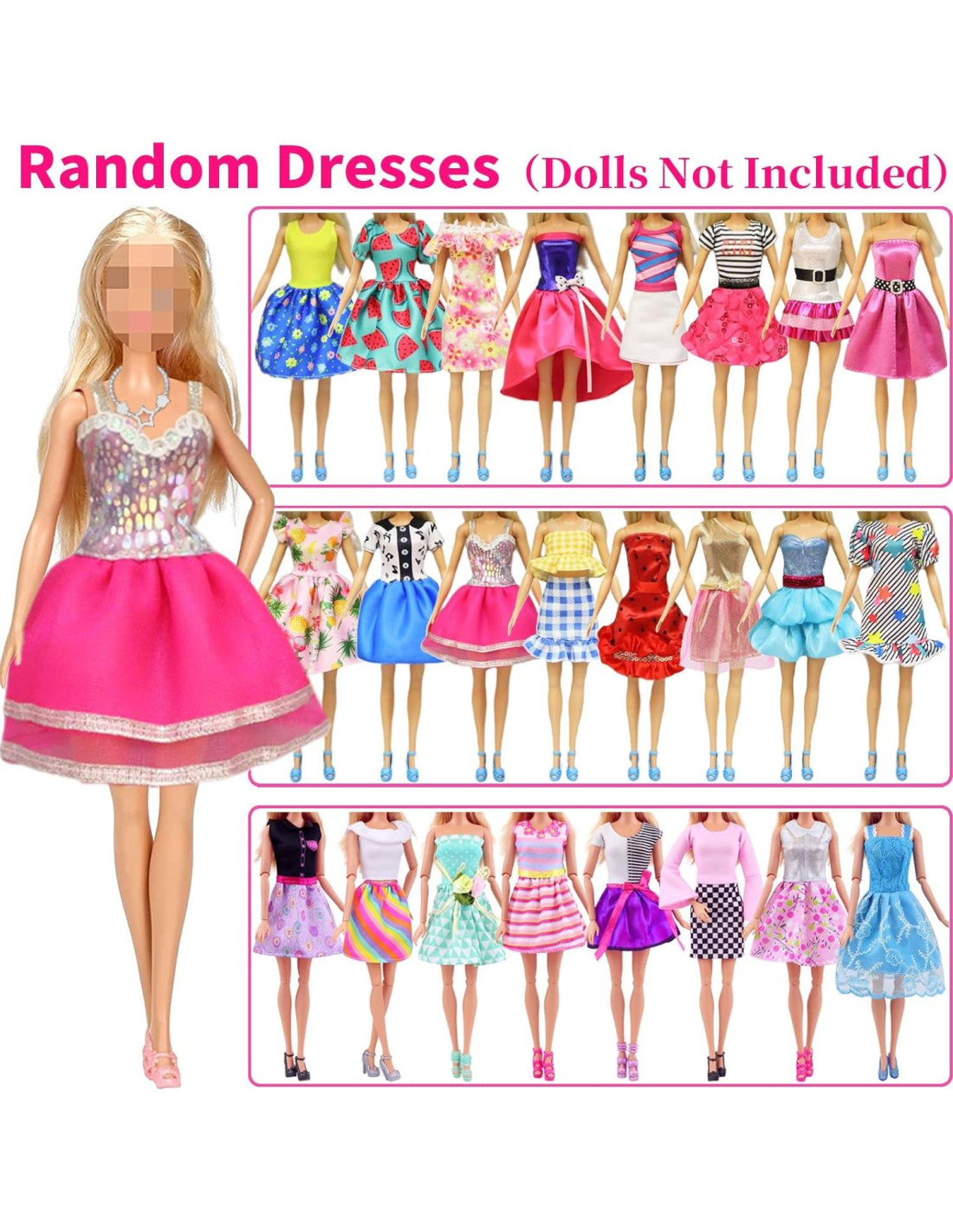 - El paquete incluye: 3 Vestidos de Moda, 10 Vestidos Cortos, 3 Conjuntos de Ropa de Moda (3 tops + 3 pantalones), 10 Collares, 10 pares de Zapatos, un total de 39 piezas (Estilo aleatorio)