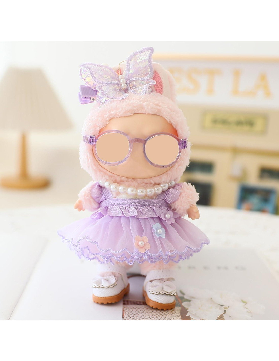- [Incluye paquete] 5 piezas de ropa de muñeca de peluche de 15 cm y 17 cm, incluyendo 1 x adorable lazo, 1 x gafas moradas, 1 x collar de perlas, 1 x falda de tul morada, 2 x zapatos de princesa, sin muñeca. La ropa de muñeca tiene cierta elasticidad, es fácil de poner y quitar, y es más conveniente ponerla desde los pies hacia arriba.