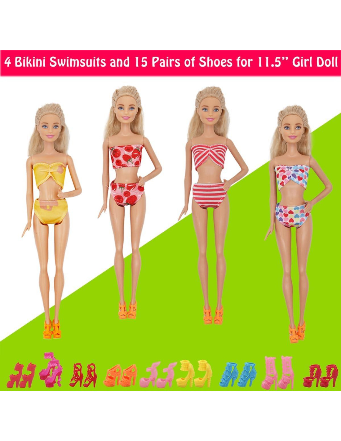- Ropa para Muñecas Niñas: 1 parte superior de bikini verde que combina con 1 vestido, 1 parte superior de bikini azul que combina con 1 falda, 1 chaleco morado tembloroso que combina con 1 vestido morado tembloroso, 1 chaleco impreso blanco que combina con 1 pantalón corto estilo Hawaii, 1 chaleco de rayas azul que combina con 1 pantalón corto blanco, 1 parte superior de bikini de rayas de color con un pantalón de baño, 1 parte superior de bikini de rayas rosa con un pantalón de baño, 1 parte superior de bikini de rayas azul con un pantalón de baño, 1 parte superior de bikini de rayas amarillas con un pantalón de baño.