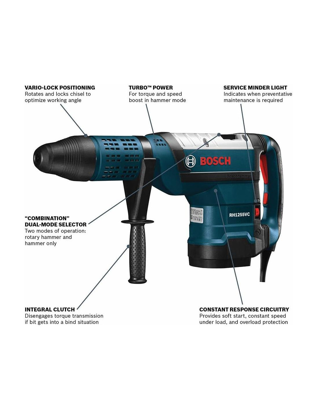 El Bosch RH1255VC martillo rotativo SDS-max de 2 pulgadas tiene Turbo Power, que le da al herramienta un aumento de torque y velocidad en modo martillo. También proporciona 14.1 ft.-lbs. (19,1 J) de energía de impacto para una potencia de primera categoría. Con menos de 27 lbs. (12,25 kg), tiene una relación rendimiento-peso excepcional en un martillo de 2 pulgadas. Cuenta con Control de Vibración para un mayor control del operador mientras mitiga la vibración en el mecanismo del martillo y en el mango. Este martillo proporciona circuitería de Respuesta Constante para arranques suaves, colocación precisa de agujeros y velocidad constante bajo carga. La posición Vario-Lock permite rotar y bloquear el cincel con precisión. Y el sistema de brocas SDS-max proporciona cambios de broca sin herramientas.
