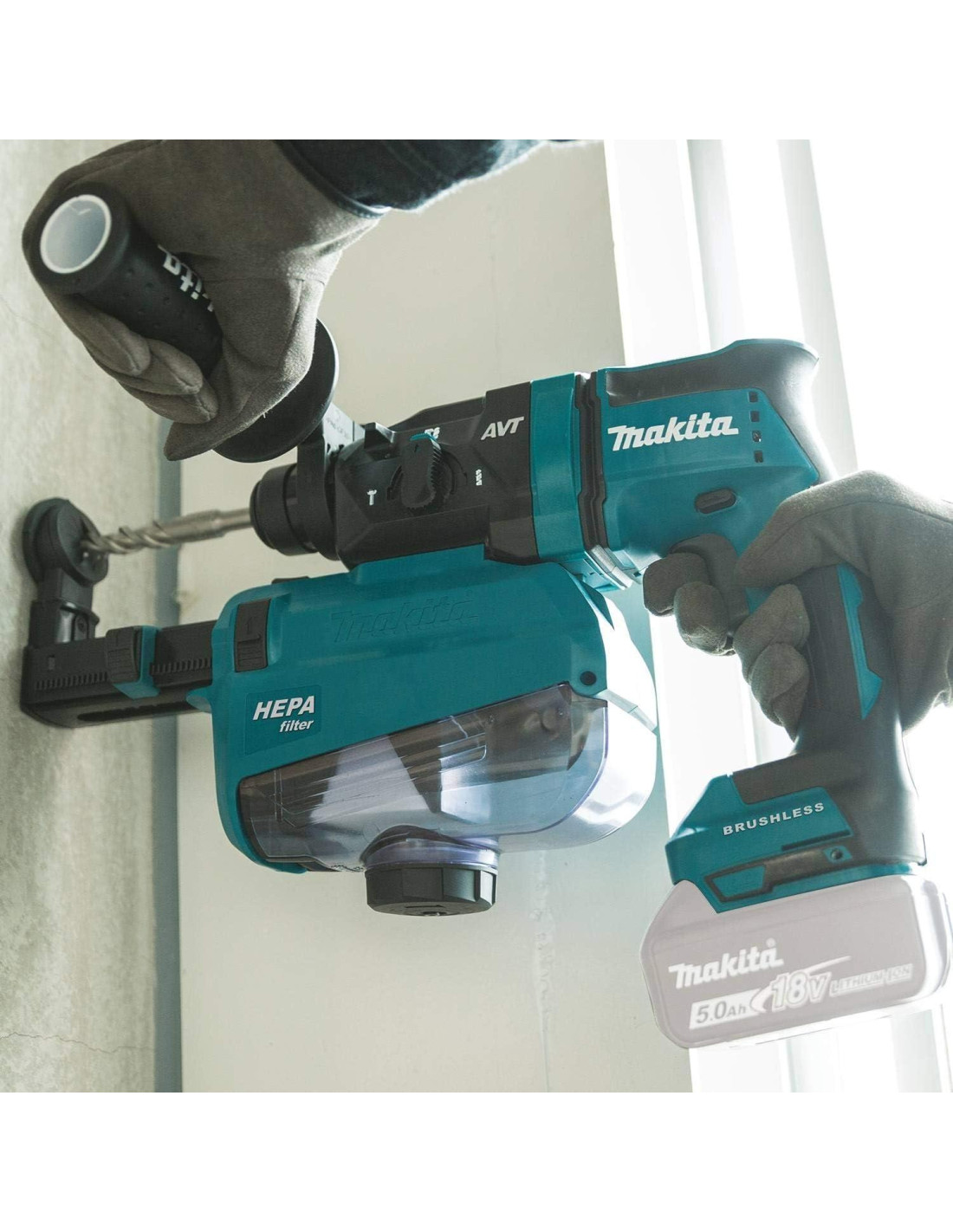 Martillo rotativo inalámbrico 18V LXT sin escobillas de 11/16" AVT, acepta brocas SDS-Plus, con accesorio de extractor de polvo HEPA, solo herramienta (XRH12ZW) es una solución inalámbrica para concreto que cuenta con capacidad AWS para máxima eficiencia y conveniente extracción de polvo. El eficiente filtro HEPA captura el 99.97% de las partículas de 0.3 micrones y más grandes. El accesorio de extractor de polvo compatible (DX05) con filtro HEPA cumple con la Tabla 1 de OSHA. Está alimentado por tecnología 18V LXT y un motor sin escobillas eficiente para máxima potencia, velocidad y tiempo de funcionamiento para demandas con cable, sin el cable. Hay 3 modos de operación: solo rotación, martilleo con rotación y solo martilleo. El gatillo de velocidad variable permite al usuario ajustar la velocidad a la aplicación. Es ideal para una variedad de oficios, incluidos contratistas mecánicos/eléctricos/plomería, contratistas de concreto, contratistas de carreteras y puentes, trabajadores de servicios públicos, control de plagas, operaciones de mantenimiento y más. Acepta brocas SDS-Plus. El martillo rotativo es compatible con AWS con sistema inalámbrico de inicio automático, que utiliza tecnología Bluetooth para comunicación inalámbrica de encendido/apagado entre la herramienta y el extractor de polvo equipado. Para activar AWS, simplemente instale el transmisor inalámbrico de inicio automático (198901-5, se vende por separado) y sincronícelo con un extractor de polvo equipado con aws (se vende por separado). Para reducir la vibración, está equipado con tecnología antivibración (AVT). Más que solo un mango acolchado, AVT es un contrapeso interno que utiliza presión de aire para mover los pistones de contrapeso en la dirección opuesta del pistón de accionamiento para reducir activamente la vibración sin comprometer el rendimiento. Es parte del sistema de 18V de iones de litio en expansión de Makita, el sistema de herramientas inalámbricas más grande del mundo alimentado por baterías de iones de litio de estilo deslizante de 18V. Las baterías de iones de litio de 18V de Makita tienen los tiempos de carga más rápidos en sus categorías, por lo que pasan más tiempo trabajando y menos tiempo sentadas en el cargador. Para mejorar el rendimiento de la herramienta y extender la vida útil de la batería, Makita creó Star protection Computer controls. Star protection es una tecnología de comunicación que permite a la herramienta y la batería equipadas con Star Protection intercambiar datos en tiempo real y monitorear condiciones durante el uso para proteger contra sobrecargas, sobredescargas y sobrecalentamiento. Para mayor versatilidad, la herramienta también puede ser alimentada por baterías de iones de litio compactas y 18V LXT de Makita con el símbolo Star en la batería que indica protección Star en su interior.