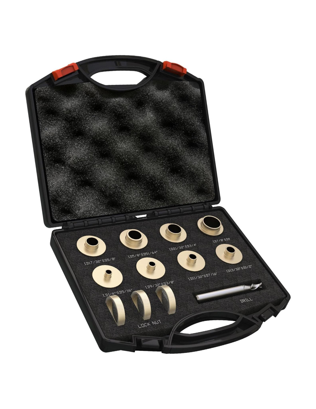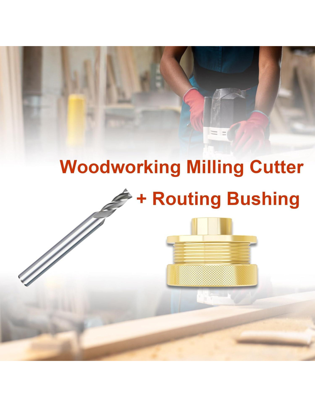 - Caja de Herramientas de Carpintería: Adecuada para una amplia gama de aplicaciones de router, la opción versátil para una variedad de tareas de carpintería. Los bujes de carpintería en 8 tamaños, OD 5/16" (0,79 cm) - ID 1/4" (0,64 cm), OD 9/32" (0,71 cm) - ID 3/8" (0,95 cm), OD 7/16" (1,11 cm) - ID 11/32" (0,87 cm), OD 1/2" (1,27 cm) - ID 13/32" (1,03 cm), 5/8" (1,59 cm) OD - 17/32" (1,35 cm) ID, 51/64" (1,98 cm) OD - 5/8" (1,59 cm) ID, 3/4" (1,91 cm) OD - 21/32" (1,67 cm) ID, OD 1" (2,54 cm) - 7/8" (2,22 cm) ID, 3 tuercas, cortador de fresado de doble filo de eje de 1/4" (0,64 cm) en caja de herramientas negra.