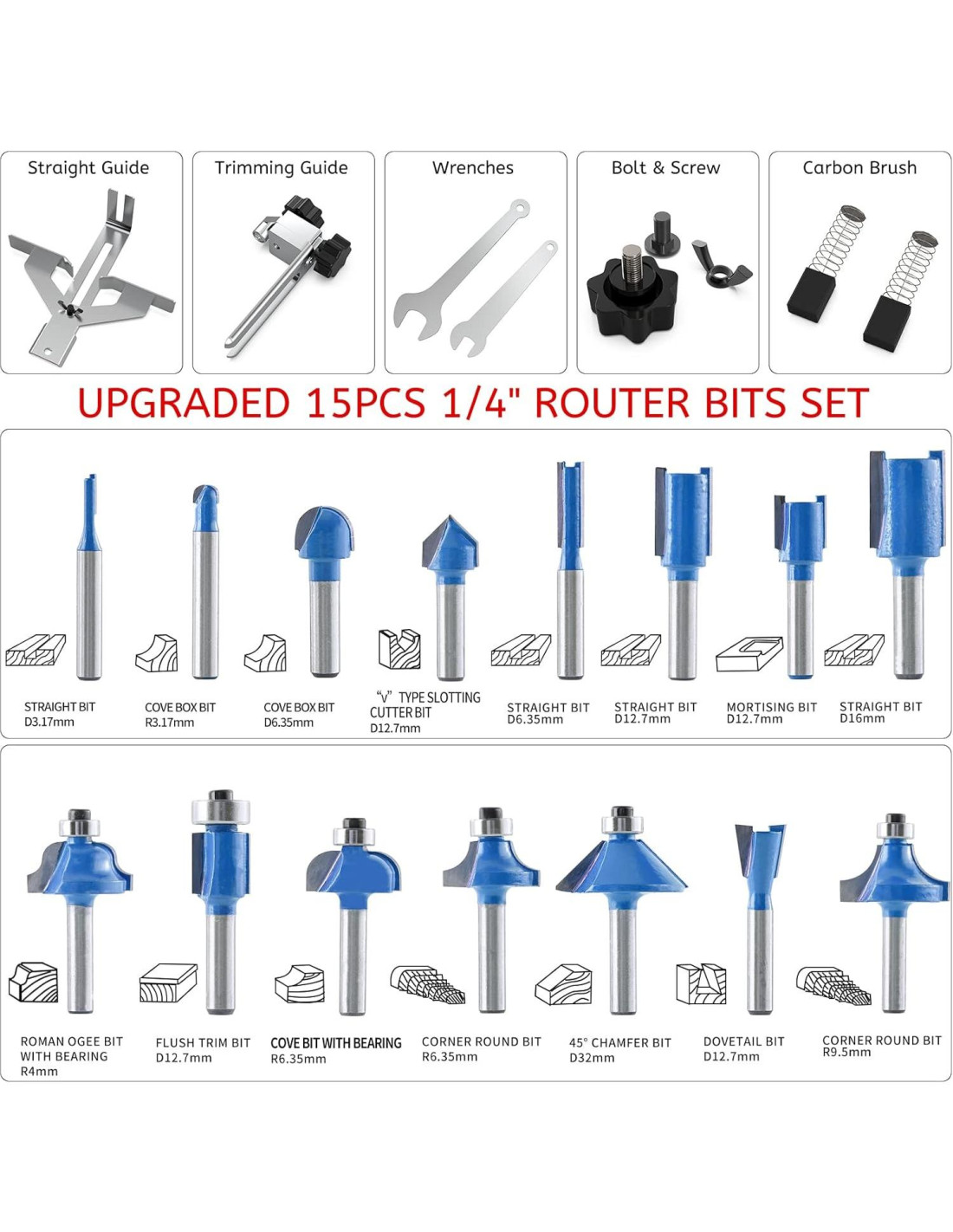 - Obtendrás Nuestra recortadora de madera viene con una variedad de accesorios. No solo recibirás la máquina router en sí, sino también 15 brocas de router para trabajos en madera, una guía recta, una guía de recorte, llaves, cepillo de carbón, un organizador de madera, tornillos y pernos. Ya seas un profesional o un entusiasta del bricolaje, esta herramienta router compacta es una valiosa adición a tu caja de herramientas.