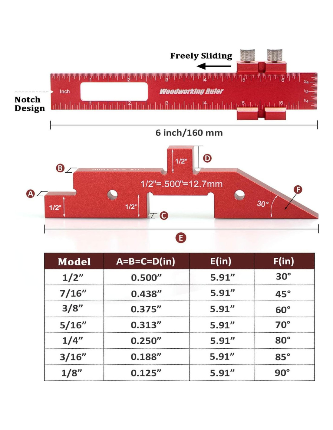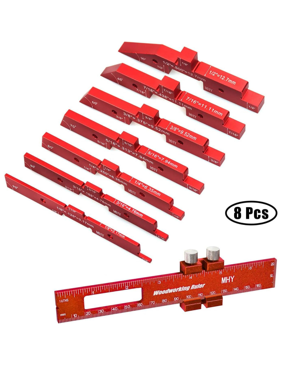 - Versatilidad Definitiva 4 en 1: Medidor de Altura, Profundidad, Ángulo y Apilamiento: Utiliza el hombro escalonado, la joroba de camello, el corte central o el grosor completo del bloque para ajustar cercas de mesas de router, brocas, cuchillas y profundidades de perforación. Incluye 7 ángulos de bisel (30-90) para un medidor de inglete instantáneo para alineaciones de sierras de mesa y trineos de corte transversal. (Grosor variable por pieza)