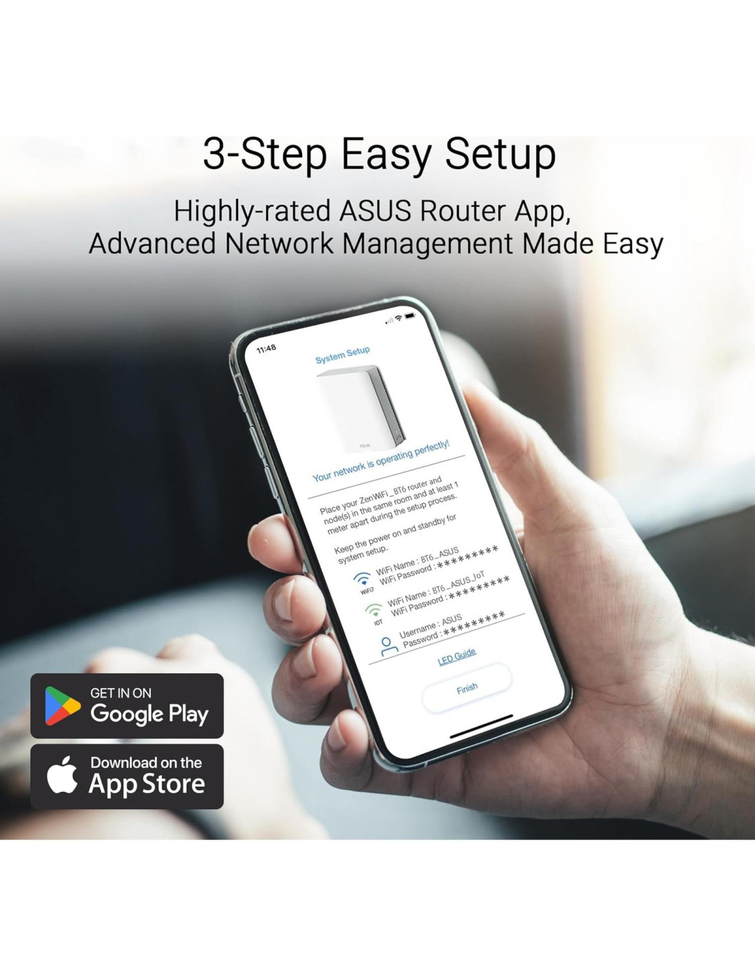 - Smart AiMesh impulsado por IA amplía la cobertura hasta 7600 pies cuadrados (3pk) y fácil extensibilidad con enrutadores ASUS compatibles para un WiFi seguro y sin interrupciones en todo el hogar
