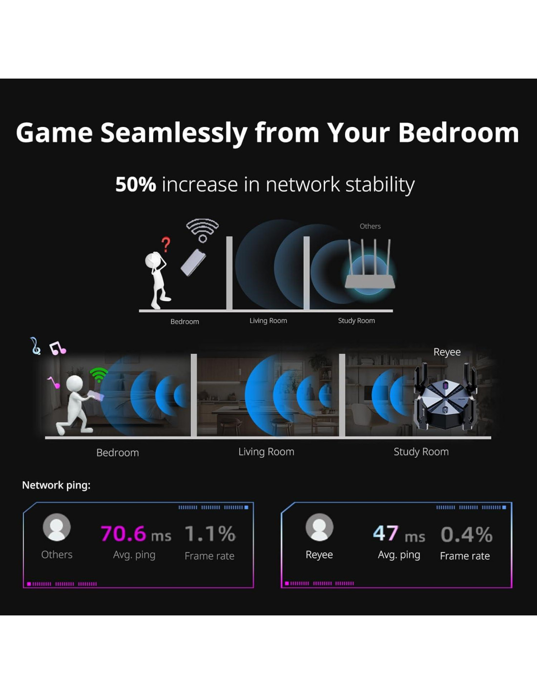 - Router Reyee Wi-Fi 6: Disfruta de velocidades ultrarrápidas de hasta 5952 Mbps con el último Wi-Fi 6 (802.11ax) y canal de 160 MHz. Procesador: CPU quad-core de 64 bits a 2.0 GHz, lo suficientemente potente para gestionar sin esfuerzo incluso el tráfico de juegos más intensivo en datos.
