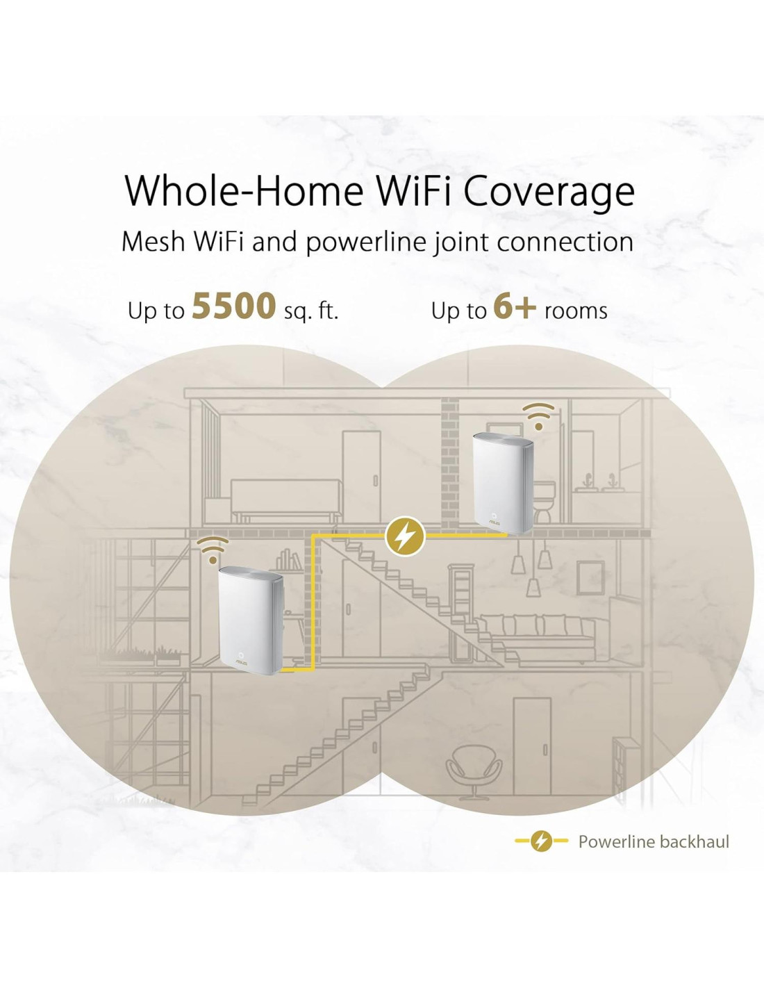 El sistema ZenWiFi AX híbrido incluye un par de enrutadores WiFi ASUS AX1800 con red de línea eléctrica HomePlug AV2 de 1300 Mbps incorporada. Presenta tecnologías únicas que te brindan conexiones WiFi súper rápidas, confiables y seguras, dentro o fuera de tu hogar. Aviso: El rendimiento real de datos y la cobertura WiFi variarán según las condiciones de la red y factores ambientales, incluyendo el volumen de tráfico de la red, material y construcción del edificio, y sobrecarga de la red, lo que resulta en un menor rendimiento real de datos y cobertura inalámbrica.