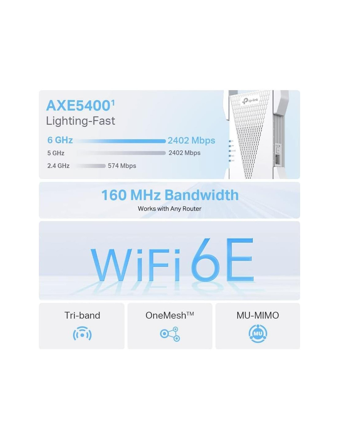 - Wi-Fi de Tres Bandas AXE5400 - Aumenta las velocidades generales hasta un increíble 5400 Mbps.