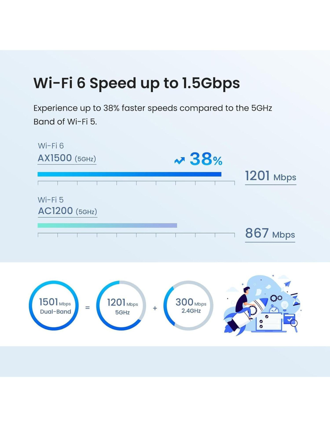 - Disfruta de una transmisión, juegos, descargas y más más suaves y estables con velocidades de Wi-Fi de hasta 1.5 Gbps (1201 Mbps en la banda de 5 GHz y 300 Mbps en la banda de 2.4 GHz)