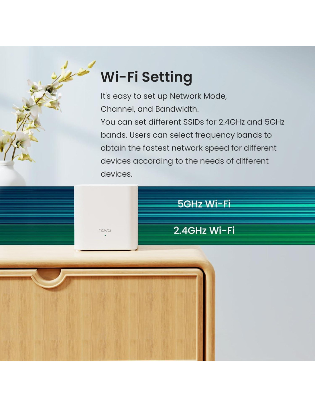 - Cada unidad trabaja en conjunto para una experiencia en línea sin interrupciones en una red Mesh. Puedes establecer diferentes SSIDs para las bandas de 2.4G y 5G. Los usuarios pueden seleccionar bandas de frecuencia para obtener la velocidad de red más rápida para diferentes dispositivos según las necesidades de diferentes dispositivos
