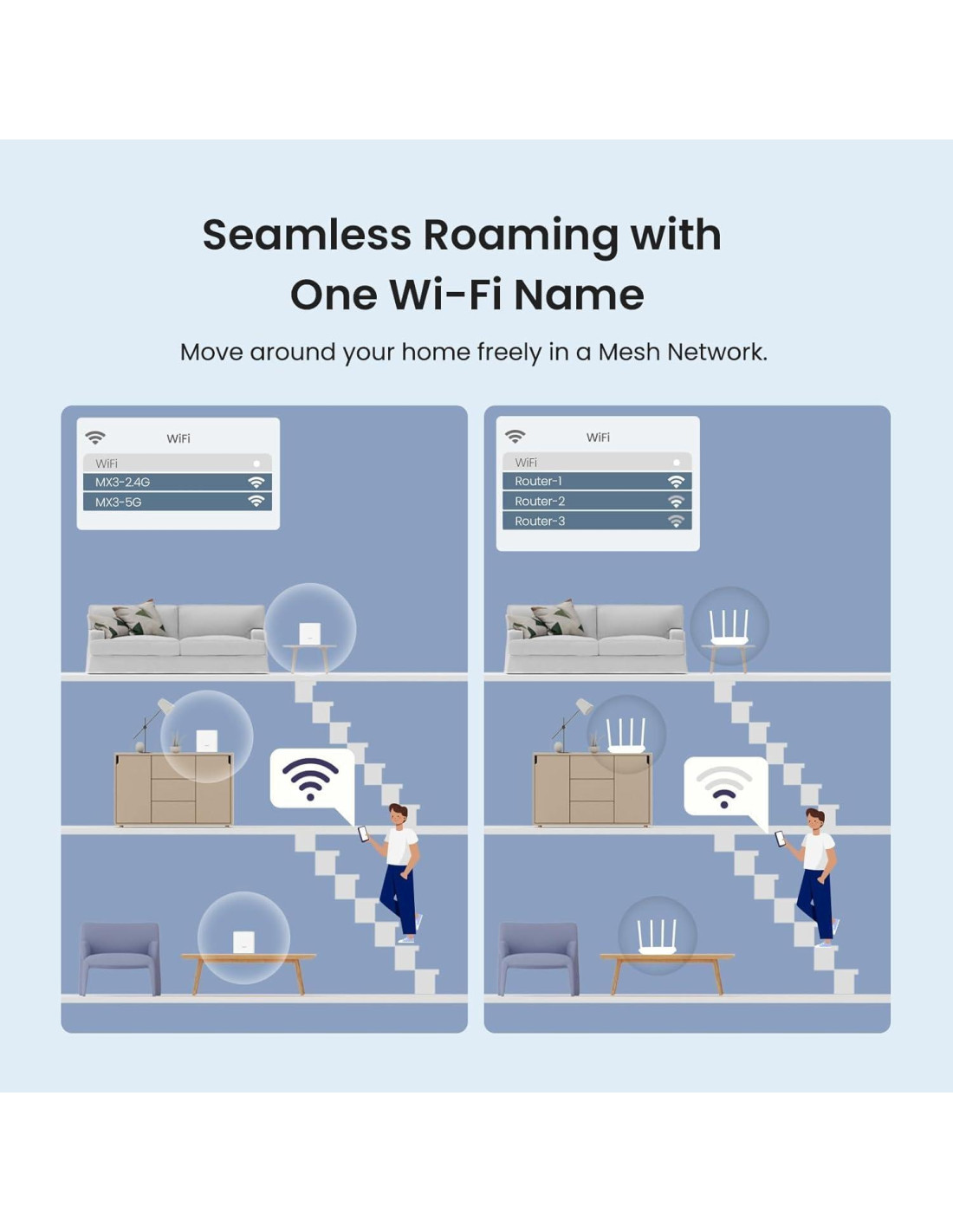 - Cobertura del enrutador Mesh MX3 de hasta 325.16 m con una red Wi-Fi mesh más rápida y estable, eliminando zonas muertas de Wi-Fi. Disfruta de la mejor señal en cualquier rincón de la casa