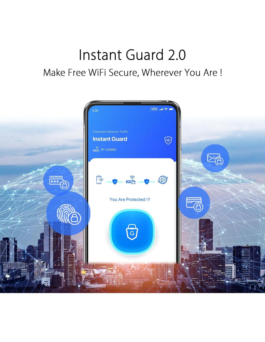 Velocidad Atractiva, Conectividad Confiable con protección de red VPN integral incorporada proporcionada por la avanzada tecnología de seguridad de ASUS, el RT-AX5400 definitivamente puede superar tu imaginación sobre la experiencia de red y funcionar perfectamente con tus dispositivos WiFi existentes. ¡Prepárate para una conectividad ultra-segura y un rendimiento poderoso! Aviso: El rendimiento real de datos y la cobertura WiFi variarán según las condiciones de la red y factores ambientales, incluyendo el volumen de tráfico de red, material y construcción del edificio, y sobrecarga de red, resultando en un menor rendimiento real de datos y cobertura inalámbrica.
