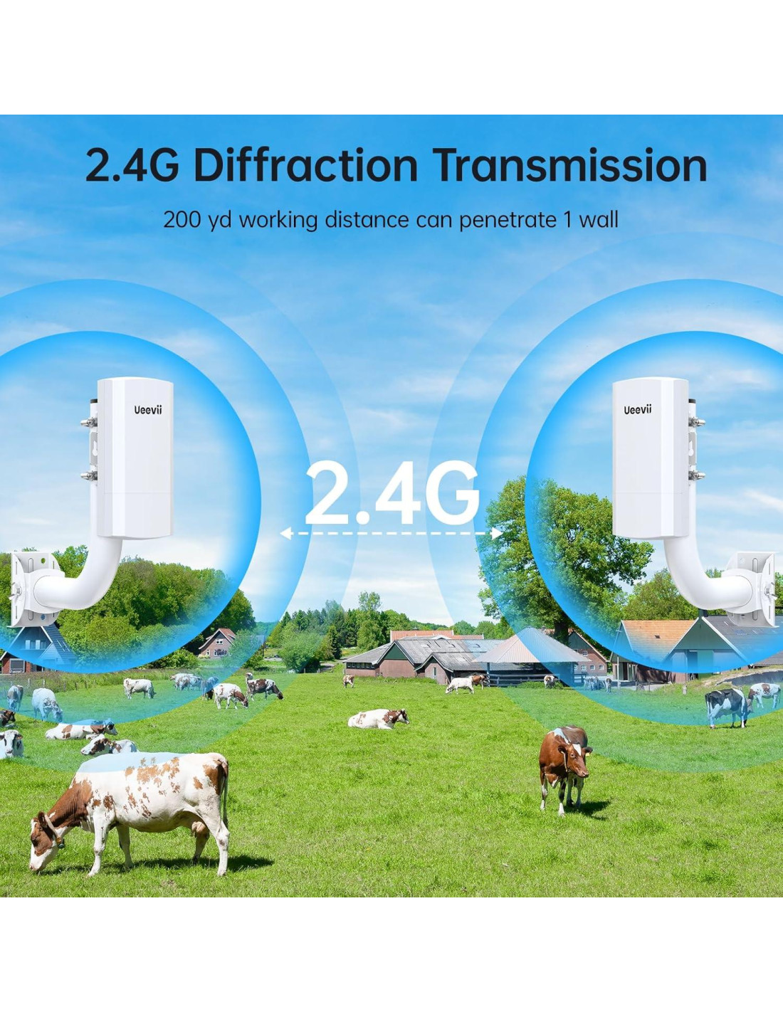 - Transmisión de Largo Alcance (Hasta 1KM): El Puente Inalámbrico UeeVii de 2.4G proporciona cobertura WiFi punto a punto sin interrupciones, extendiendo el rango de tu red hasta 1 Km. Ideal para conectar edificios, extender internet a graneros, cobertizos, o incluso a la casa de tu vecino, proporcionando conexiones fuertes y estables con mínima interferencia