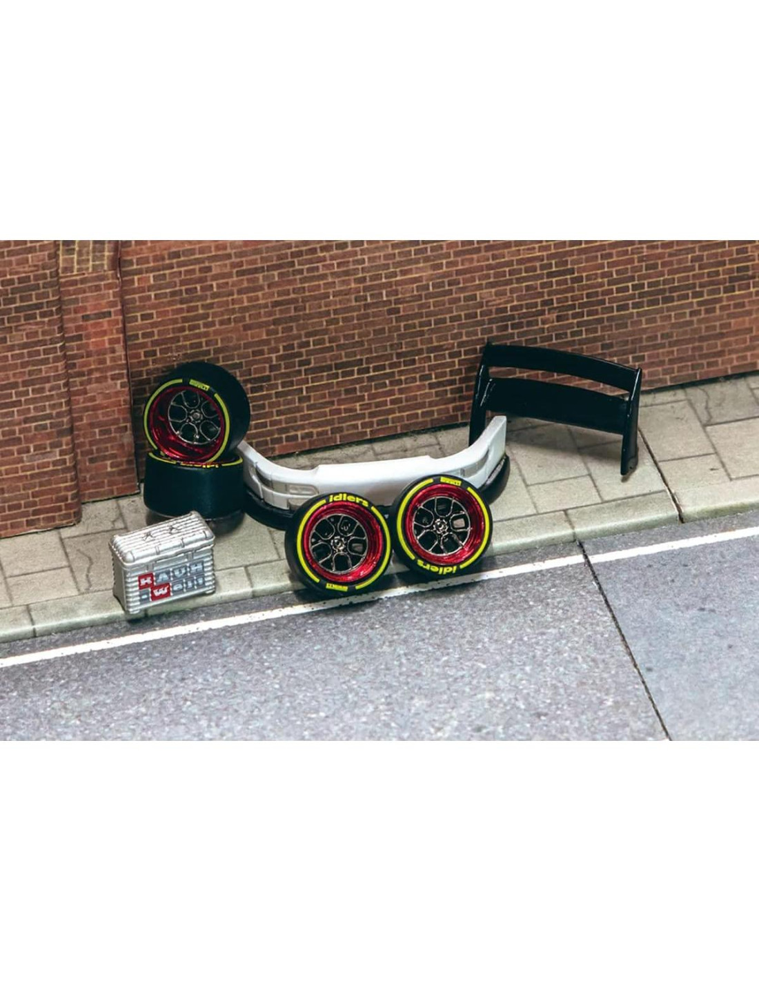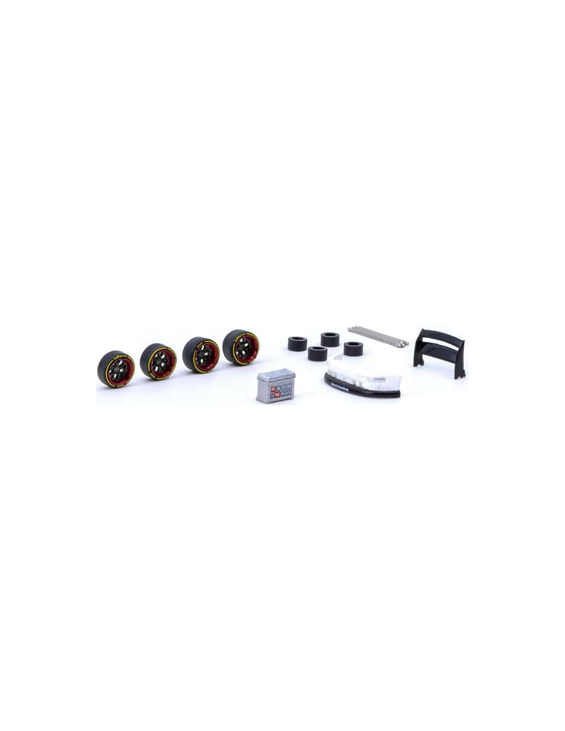 - 1) Maleta. 2) Espaciador (4 piezas). 3) Parachoques delantero 993. 4) Alerón trasero de doble nivel. 5) Eje normal (2 piezas). 6) Ruedas traseras (2 piezas). 7) Eje de camber (2 piezas). 8) Ruedas delanteras (2 piezas).