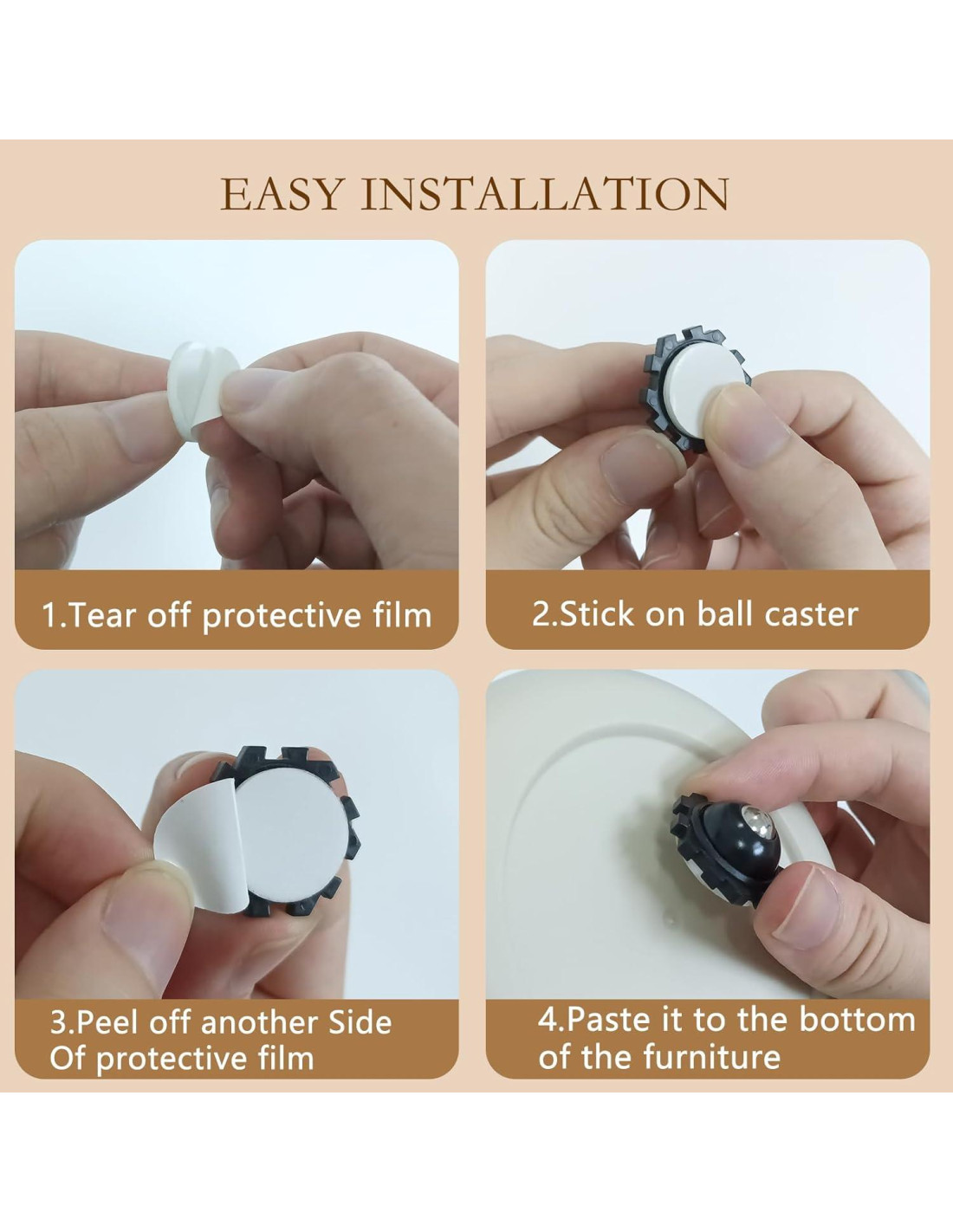 - [Instalación Rápida y Fácil] Es muy fácil usar ruedas rodantes para muebles y se pueden instalar en solo unos minutos. Usa las almohadillas adhesivas incluidas para pegar las ruedas giratorias a la parte inferior de cafeteras, macetas, etc., y añade más ruedas según el peso para asegurar la estabilidad. Se recomienda esperar 24 horas antes de usar, para que las almohadillas adhesivas se adhieran más firmemente.