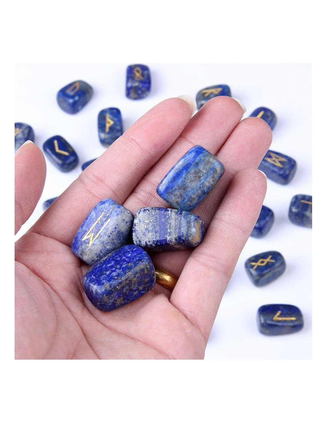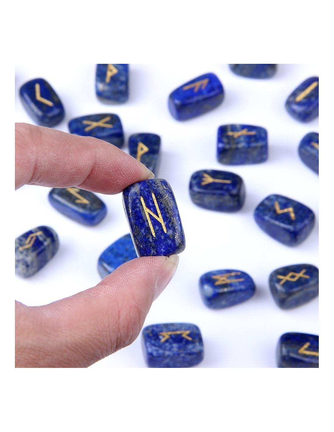 - Conjunto de 25 piedras de Lapis Lazuli, incluyendo 24 piedras con grabados y una piedra en blanco.