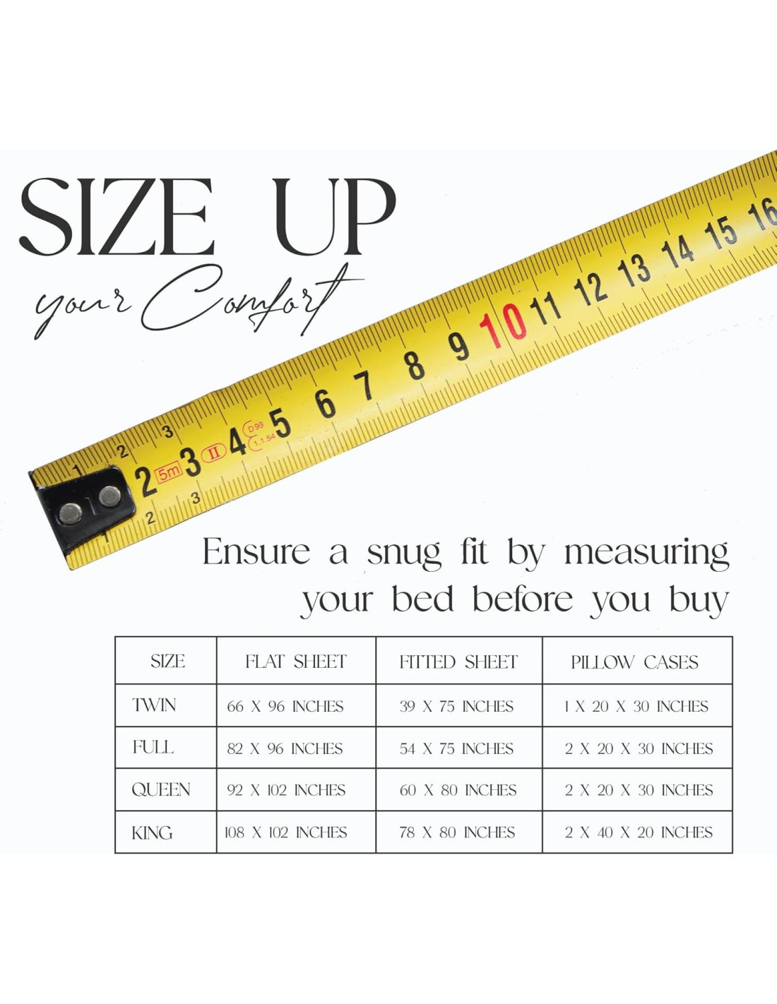 - JUEGO DE SÁBANAS KING - Ajuste Perfecto para Camas King: Este juego de sábanas King incluye una sábana ajustable inferior (198 cm x 203 cm, diseñada para ajustarse a colchones de hasta 45.72 cm de profundidad), una sábana plana (274 cm x 259 cm), y dos fundas de almohada tamaño king (51 cm x 102 cm). Perfectamente adaptado para camas king, este juego de ropa de cama de algodón asegura una cobertura completa, un ajuste fácil y una experiencia de sueño lujosa y transpirable noche tras noche.