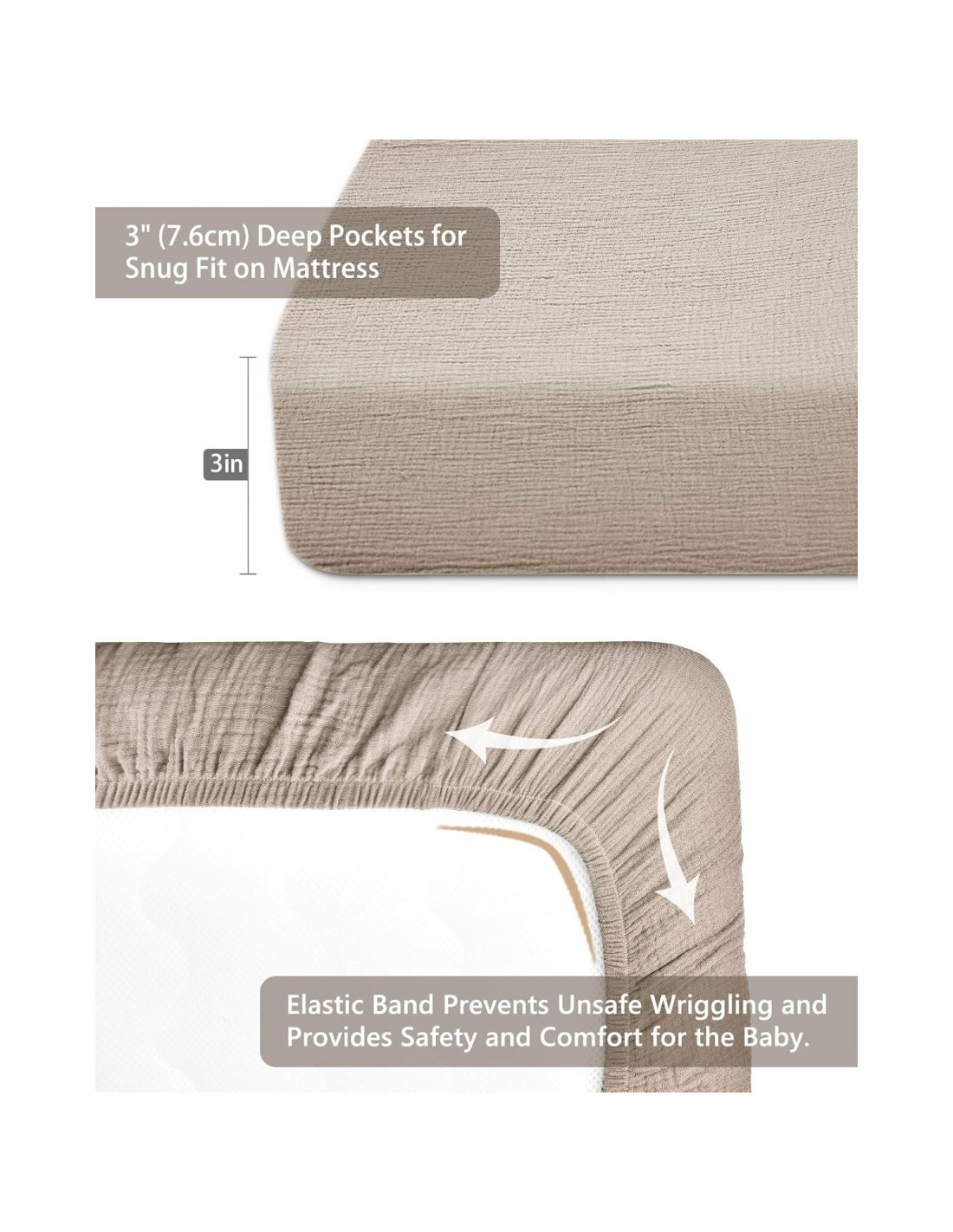 - Algodón Muslín: Nuestra sábana para pack n play está hecha de algodón muslín, con una superficie suave y un tacto cómodo, presenta una ligera caída y rigidez, adecuada para la delicada piel de su bebé, y permite que su pequeño tenga un mejor sueño.