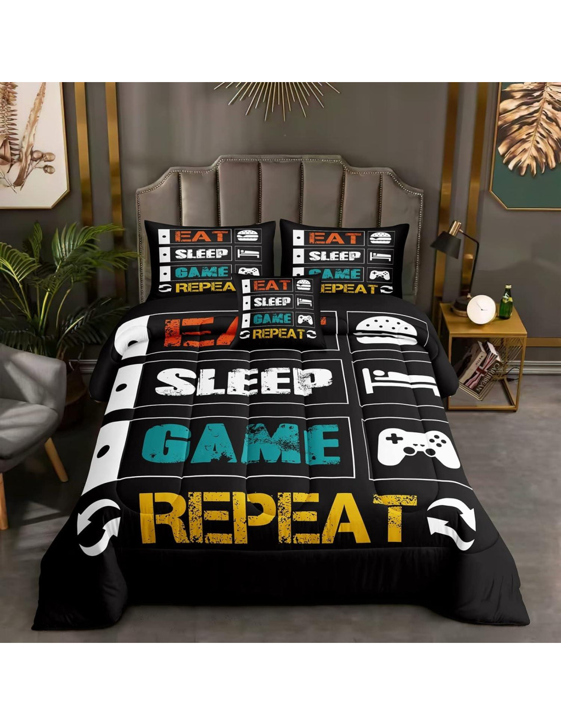 - [Tela de alta calidad y amigable con la piel] : el juego de cama de 5 piezas para niños está hecho de 100% tela de microfibra y tela de poliéster de alta calidad. Es esponjoso y suave, cálido y cómodo, resistente a las arrugas, duradero y no se desvanece. Las sábanas ajustadas de 14 pulgadas de profundidad cubren firmemente tu colchón. Las fundas de almohada son fáciles de poner y quitar. El decorativo controlador de juego fresco de la funda de almohada combina perfectamente con tu dormitorio.