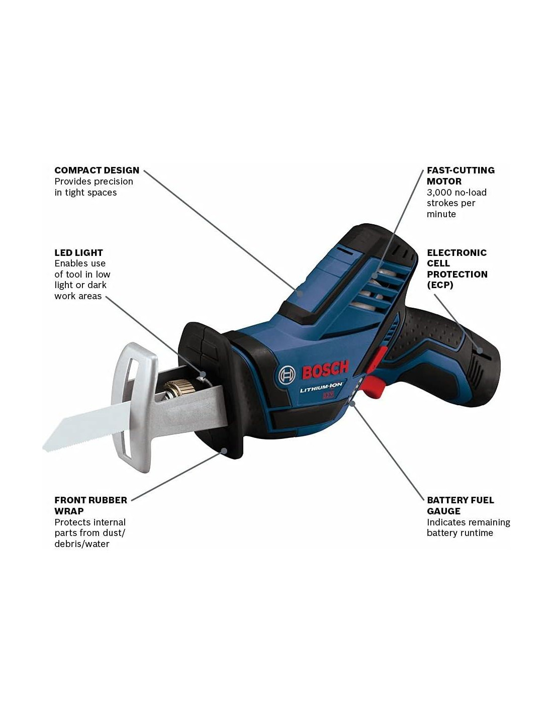 El Kit de Sierra Recíproca de Litio-Ion de 12 Voltios BOSCH PS60-102 con (1) Batería de Alta Capacidad de 1.5Ah, cuenta con un potente motor de 3,000 (SPM). Corte Rápido- Significativamente más rápido que una sierra manual, tan rápido o más rápido que nuestra competencia. Compacto- Lo suficientemente pequeño para alcanzar áreas y rincones estrechos. Medidor de Combustible- Gestión de batería más fácil para un trabajo continuo. Cómodo Mango Superior y Cuerpo con Agarre Suave- Múltiples posiciones de agarre para prevenir la fatiga de la mano.