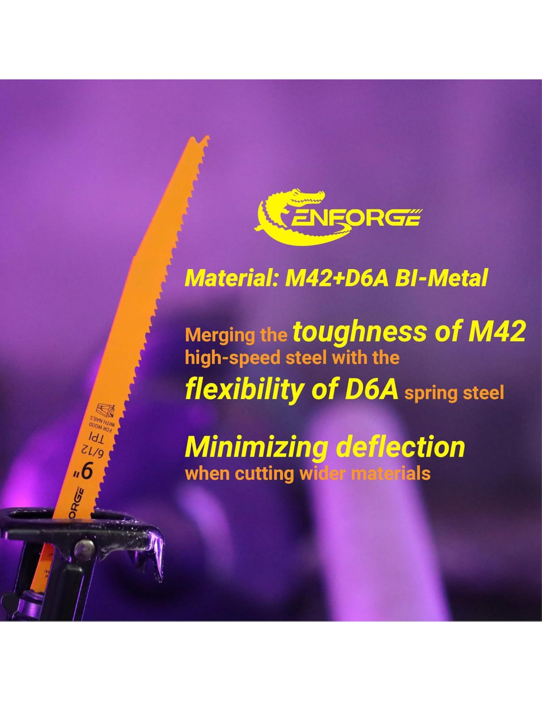 - [Características del Material]: Fabricado con una construcción BI-Metal M42+D6A, fusionando la dureza del acero de alta velocidad M42 con la flexibilidad del acero de resorte D6A. Esta combinación única proporciona una durabilidad excepcional, flexibilidad y alta estabilidad de corte (minimizando la deflexión al cortar materiales más anchos).