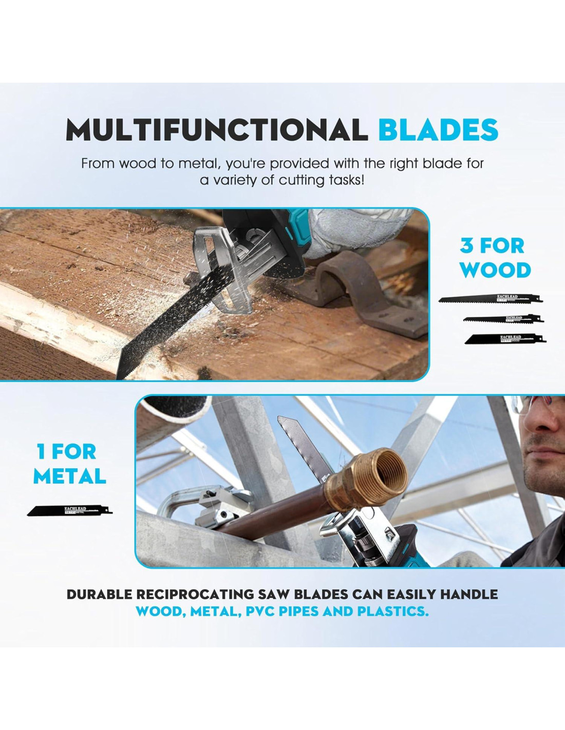 - [Juego de Cuchillas Versátil para Todas tus Necesidades de Corte] Enfrenta cualquier tarea con confianza: esta mini sierra recíproca viene con 4 cuchillas: 3 para madera y 1 para metal. Desde cortar postes de cercas hasta rebanar tubos de metal, es la sierra perfecta para abordar varios materiales. Compacta pero poderosa, está diseñada para manejar todo, desde proyectos de bricolaje hasta aplicaciones profesionales con facilidad. Profundidad máxima de corte: Metal: 20mm Madera: 25mm Tubo plástico: 130mm