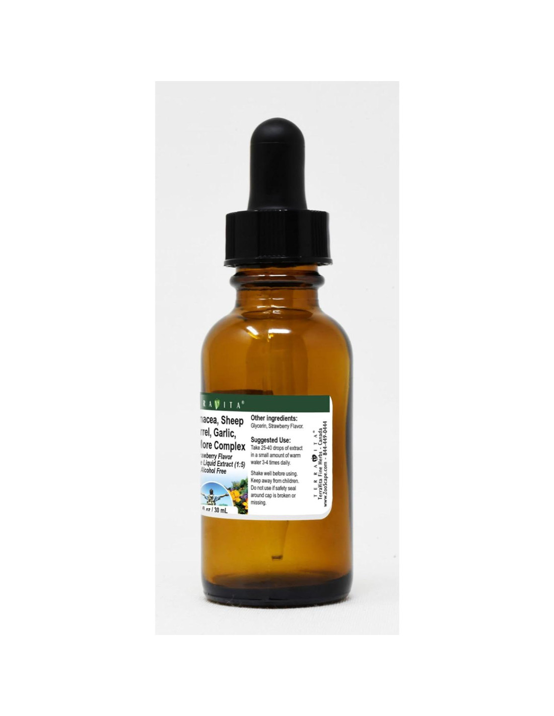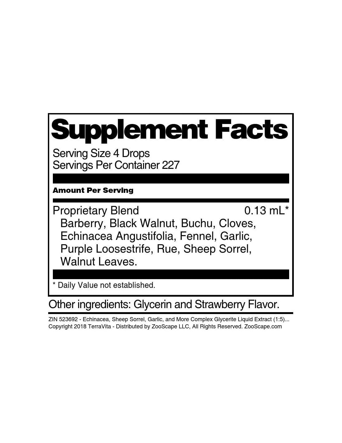 Echinacea, Sorrel de Oveja, Ajo y Más Extracto Líquido Glicerita Complejo (1:5) - Sabor Fresa (28.35 g, ZIN: 523692) Empacado en los Estados Unidos en una instalación certificada GMP (Buenas Prácticas de Manufactura). Sin rellenos. Fabricante: TerraVita Tamaño: 28.35 g Formato líquido conveniente. Ingredientes: Sabor Artificial a Fresa, Glicerina (Fuente Vegetal), Agracejo, Nogal Negro, Buchu, Clavos, Echinacea Angustifolia, Hinojo, Ajo, Lirio Púrpura, Ruda, Sorrel de Oveja, Hojas de Nogal