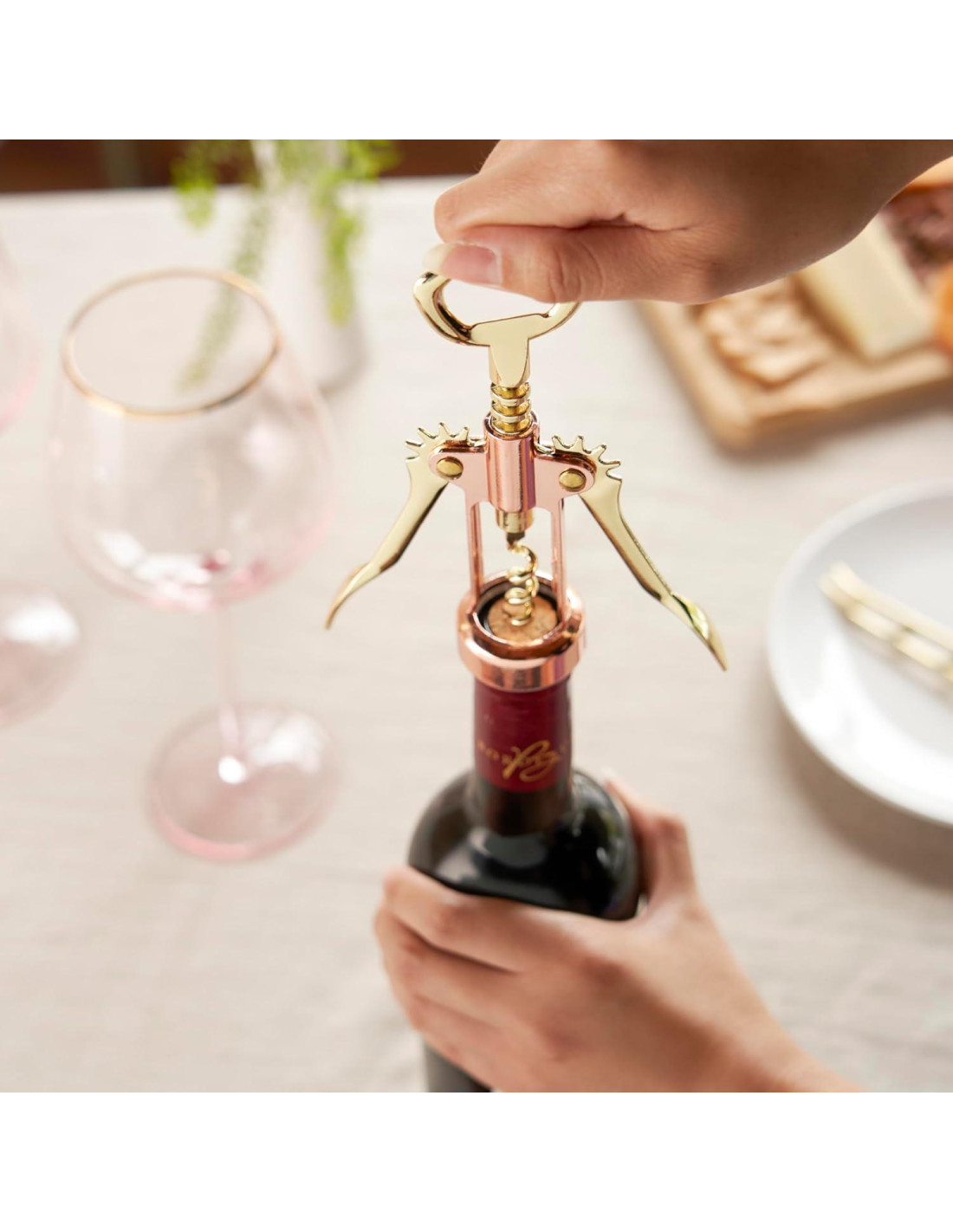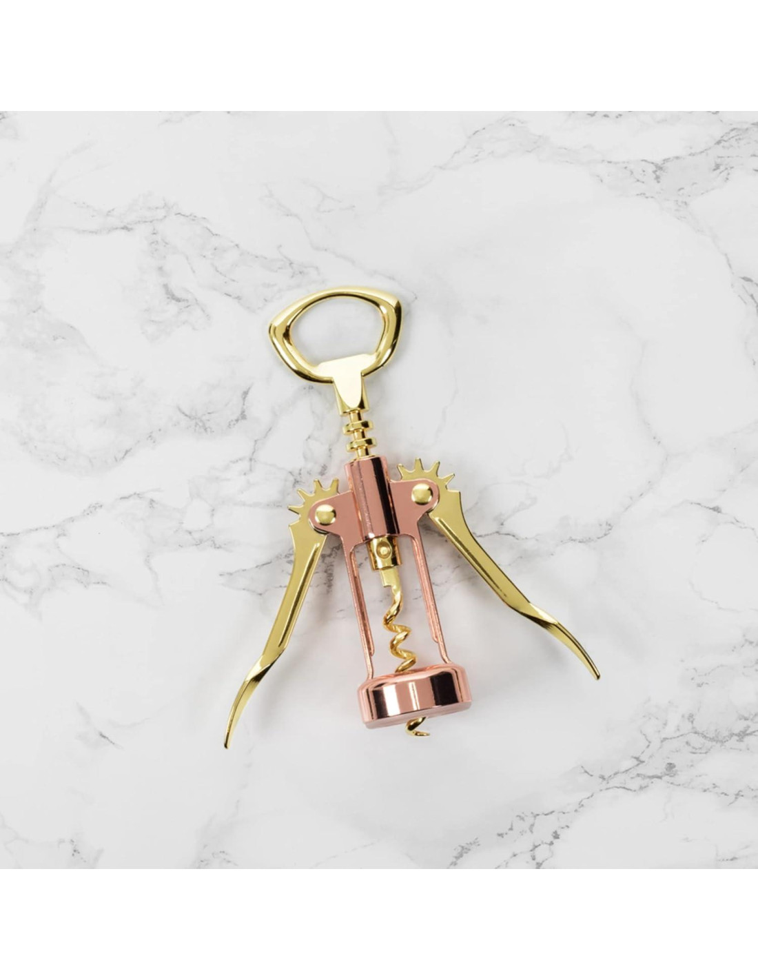 - SACACORCHOS DE VINO ALADO - Este sacacorchos alado de cobre y oro con gusano autocentrante y abrebotellas incorporado hace que el servicio de vino sea muy fácil. Nunca más luches con llaves de vino difíciles de manejar. ¡Perfecto para cenas o horas de cócteles!