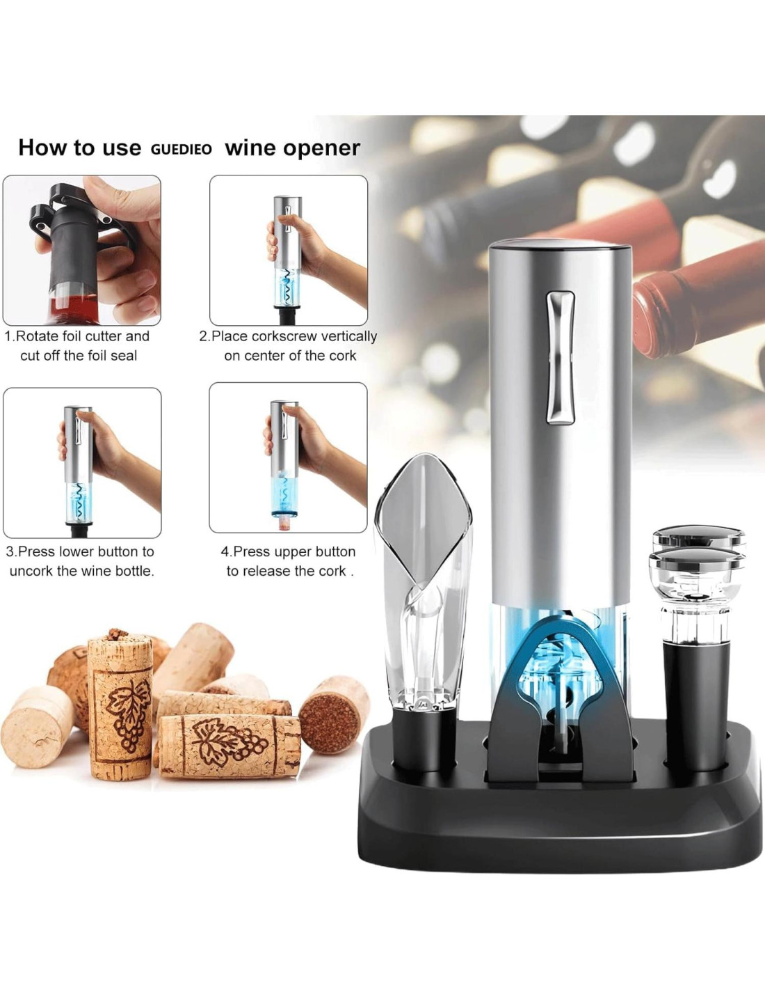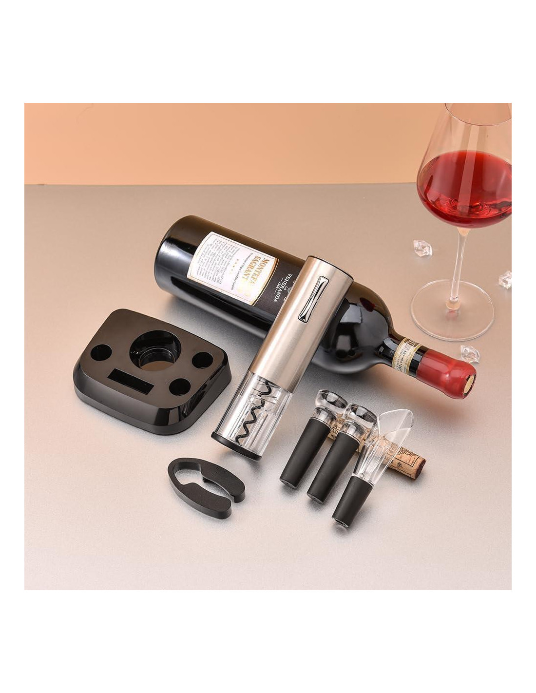Contenido de la caja: Sacacorchos Eléctrico, Cortador de Papel de Aluminio para Vino, 2 Tapones de Vino de Vacío Juego de Regalo, Base de Carga, Vertedor de Vino