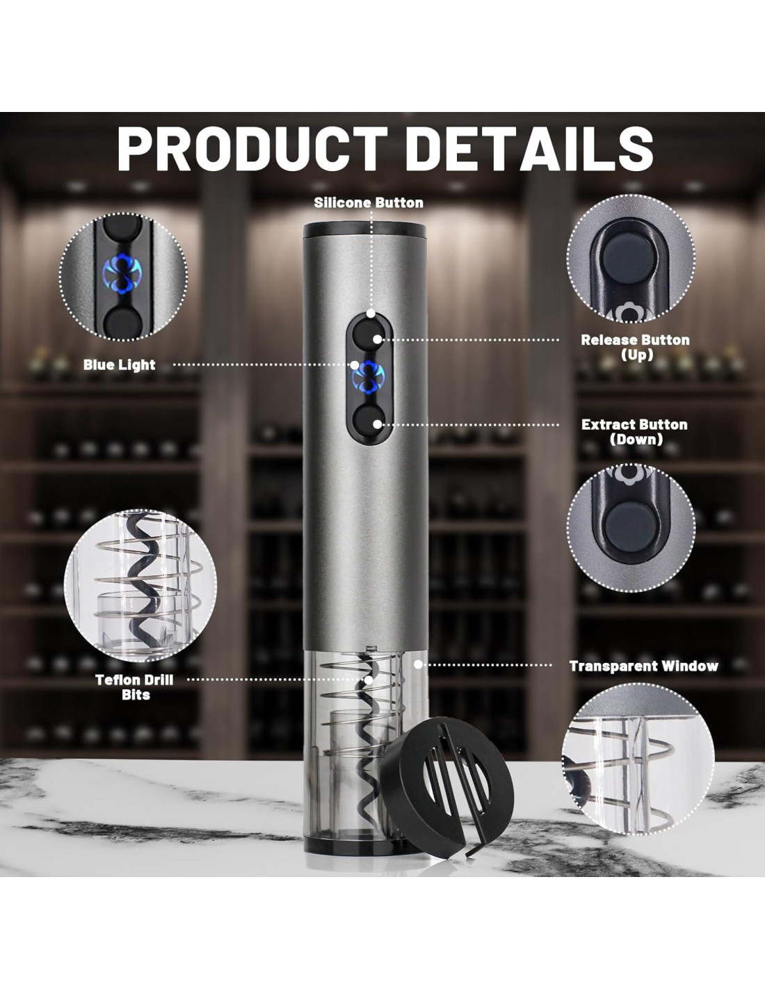 - [Juego de Sacacorchos Perfecto] El juego de sacacorchos eléctrico 4 en 1 incluye un vertedor de vino, un tapón de vacío y un cortador de papel de aluminio (también puede ser una base del sacacorchos). La cuchilla del cortador de papel de aluminio se queda atascada en la boca de la botella y gira 90 grados para cortar el papel de aluminio, el vertedor de vino puede evitar que el vino gotee y tiene la función de despertar, el tapón de vacío de vino puede ser levantado y bajado, el palanca puede extraer el aire de la botella, para lograr el efecto de conservación al vacío.