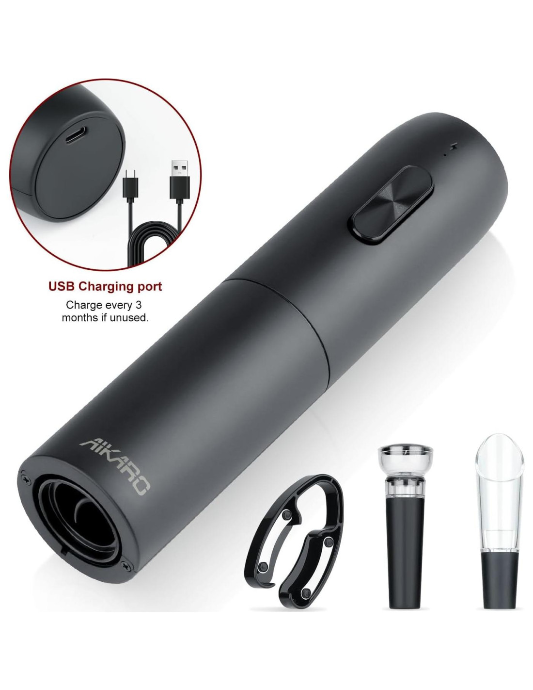 - [Práctico]: El cortador de papel de aluminio y el vertedor de vino en el conjunto de abridor de botellas de vino automático son seguros y convenientes de usar. El tapón de vino mantiene el vino fresco hasta por 7 días. Todos estos artículos se pueden almacenar en la base.