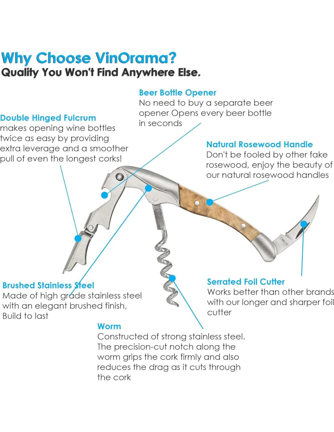 - ¡CALIDAD Y CONSTRUCCIÓN SUPERIORES! - Nosotros, en VinOrama, nos aseguramos de usar nada menos que acero inoxidable premium y procesos de producción actualizados para nuestros sacacorchos todo-en-uno, para asegurarnos de que puedan durar toda tu vida.