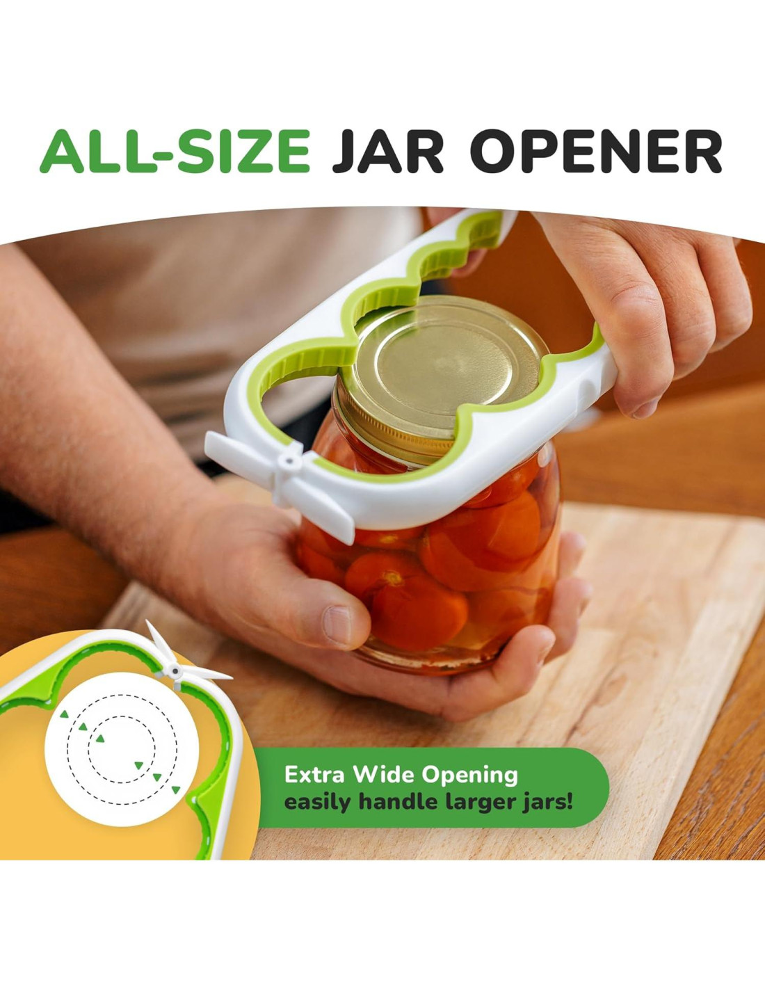 - Adecuado para Contenedores de Todos los Tamaños: Desde pequeñas botellas de medicina hasta grandes tapas, nuestro abridor de tapas y agarre para abrir tarros puede manejar todas las botellas de agua, tapas de refrescos, latas de sopa, tarros sellados al vacío, tapas lisas y con estrías, y más