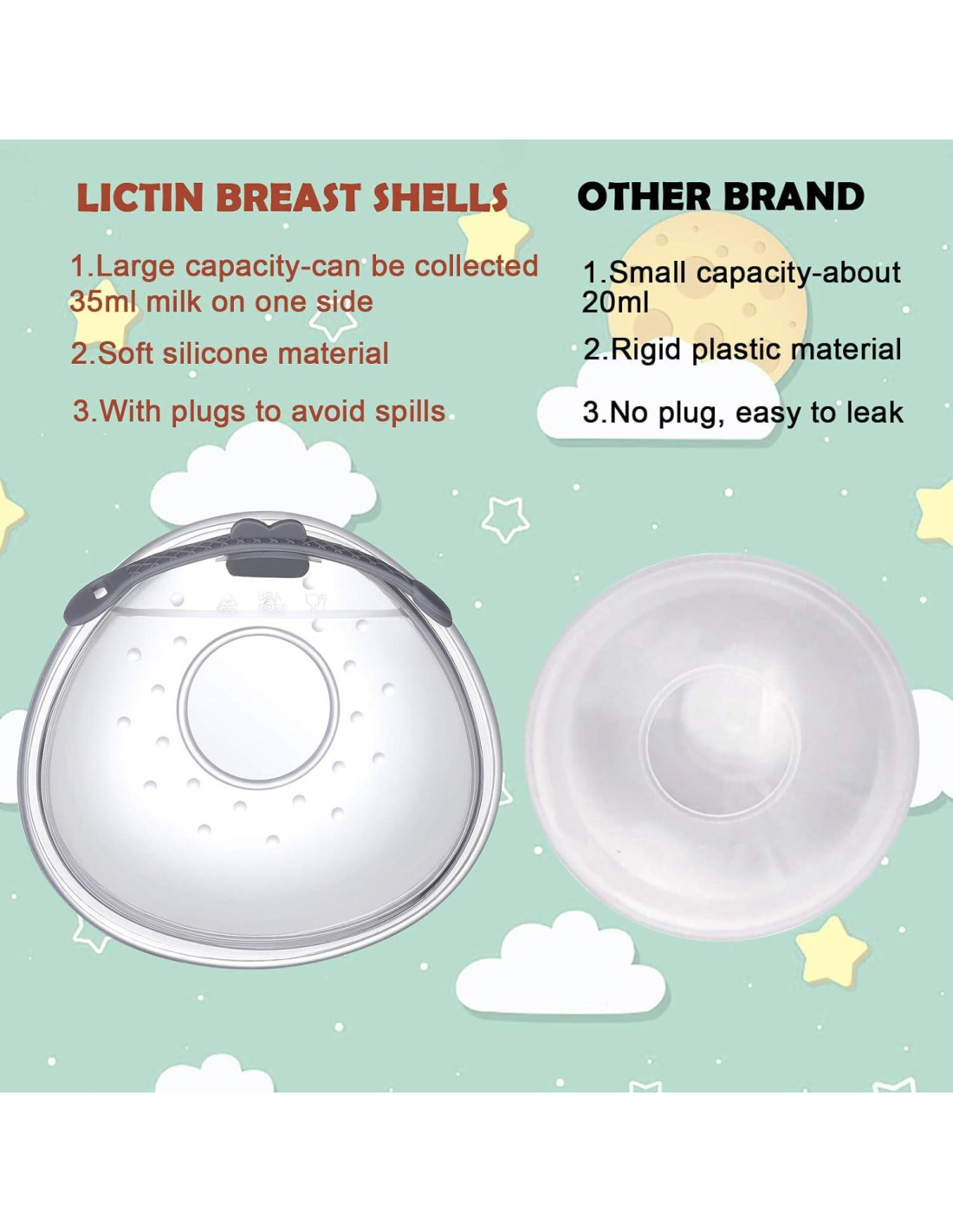 - Capacidad de 70ml: La forma de nuestra copa de lactancia es de triángulo invertido, puede ayudar a las madres lactantes a recolectar un volumen máximo de leche de hasta 70ml (aproximadamente 2.37 fl oz) en ambos lados. Comparado con los modelos antiguos en el mercado que son todos modelos redondos de pequeña capacidad de 20ml (aproximadamente 0.68 fl oz).
