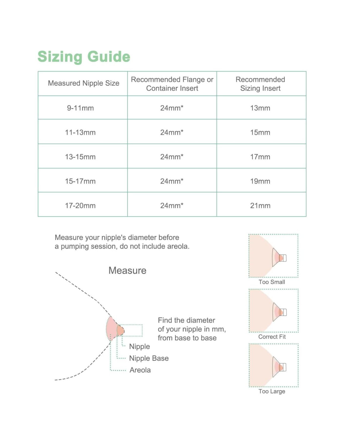 - El tamaño del inserto de flange es significativo para un bombeo cómodo y eficiente. Si tu pezón roza o se siente apretado en el canal del flange, es un tamaño de flange inadecuado y necesitas reemplazar el inserto de flange por el tamaño correcto.