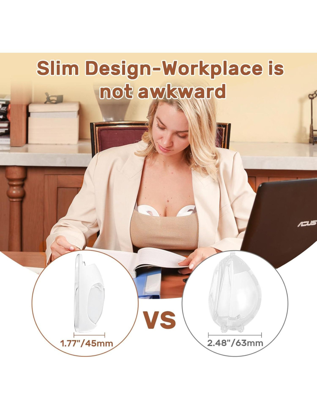 - Diseño Delgado: ¿El colector de leche será demasiado grande para destacar y ser incómodo? 1.77 pulgadas (45 mm), el diseño más delgado en el mercado, diseñado para mamás trabajadoras, invisible y no embarazoso