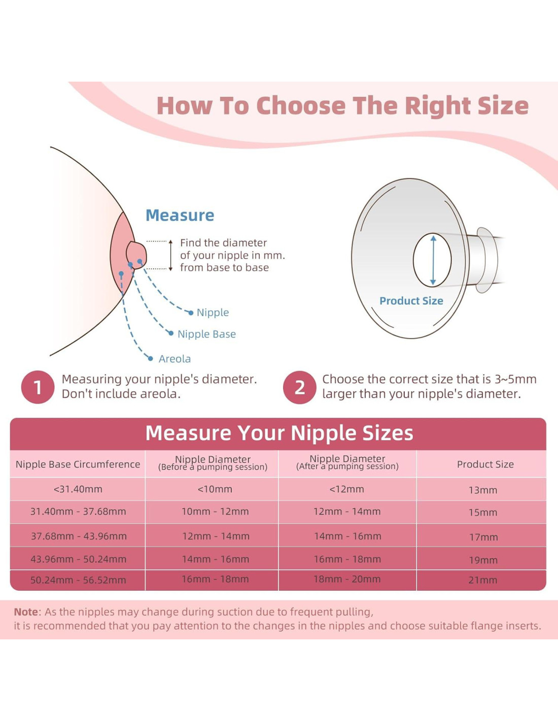 - Eligiendo el Tamaño Correcto: Según consultores de lactancia profesionales, el tamaño del pezón de una madre puede variar a lo largo del proceso de lactancia. Para evitar la molestia de compras innecesarias de diferentes tamaños de insertos de brida, ofrecemos dos combinaciones, 10PCS: 13/15/17/19/21 mm, 6PCS: 17/19/21mm. Elegir el tamaño correcto de los insertos de brida puede ayudar a que la leche materna fluya suavemente. Si descubres que el tamaño es incorrecto después de la compra, aprovecha el servicio de reemplazo gratuito ofrecido por LOTBILL.