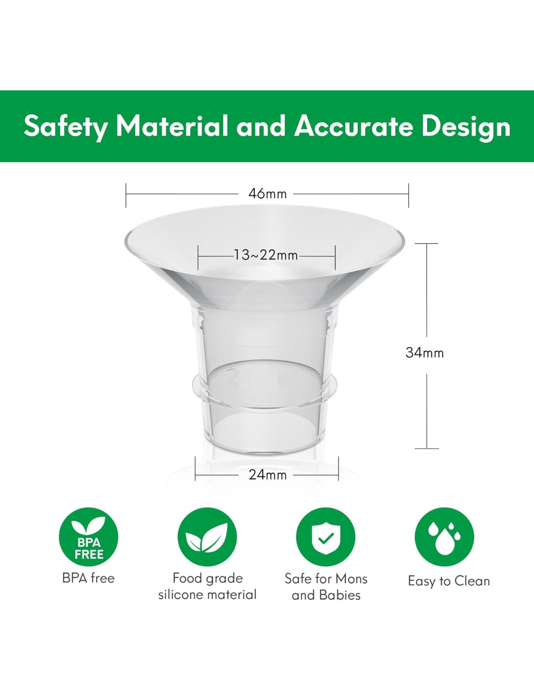 - Opciones de tamaño múltiples 10 tamaños disponibles, 13/14/15/16/17/18/19/20/21/22. Diferentes períodos de lactancia proporcionan una experiencia más cómoda, la selección del tamaño de brida correcto puede ayudar a que la leche materna fluya suavemente. Atención, estos accesorios para extractores de leche son solo adecuados para escudos/bridas de 24-25mm y no se pueden usar con otros tamaños de escudos/bridas.