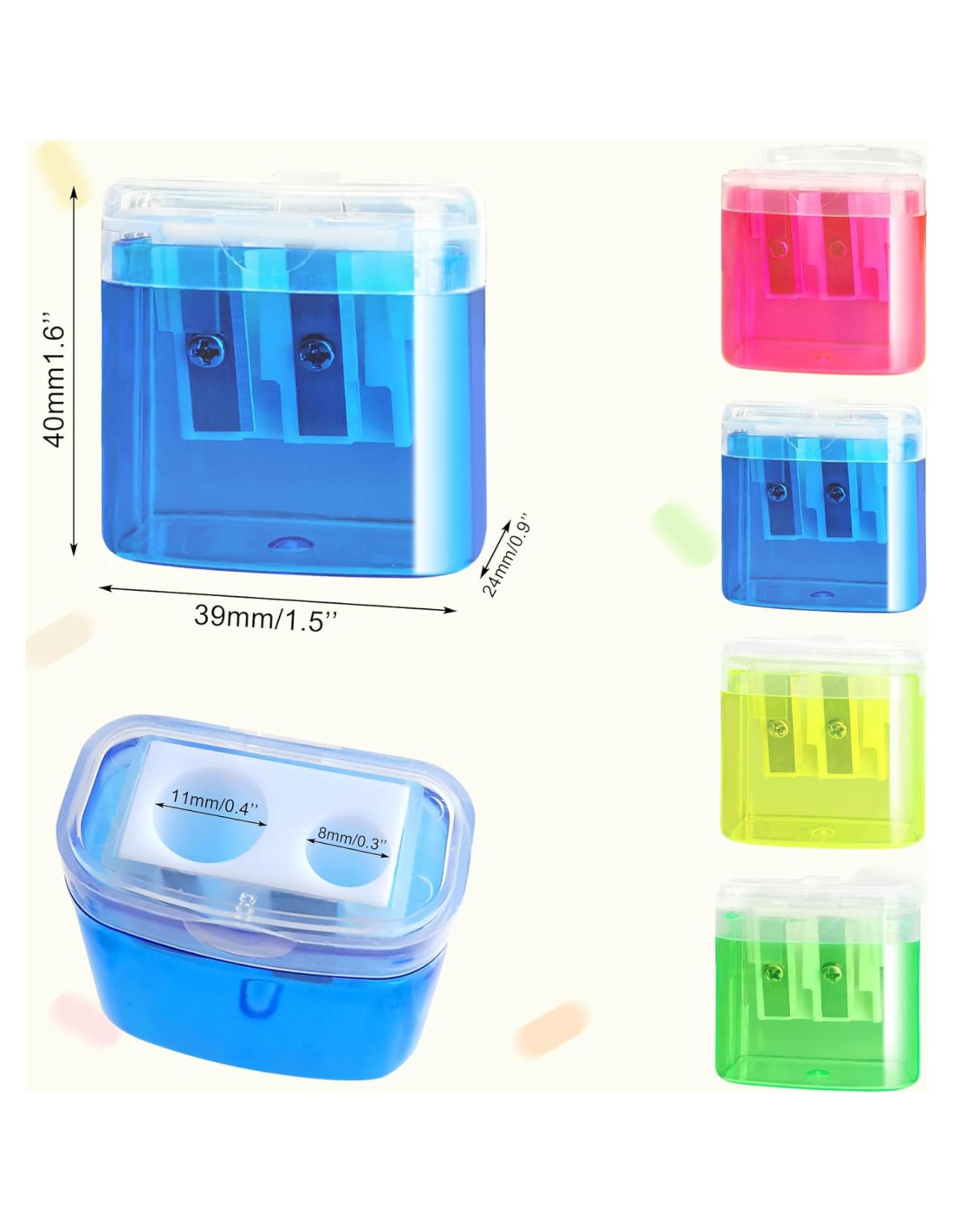- Tamaño: 4 x 3.9 x 2.4 cm (1.6 x 1.5 x 0.9"). Cada sacapuntas manual tiene dos agujeros de diferentes tamaños para lápices pequeños y grandes. Color: Azul; Verde; Rojo; Amarillo.