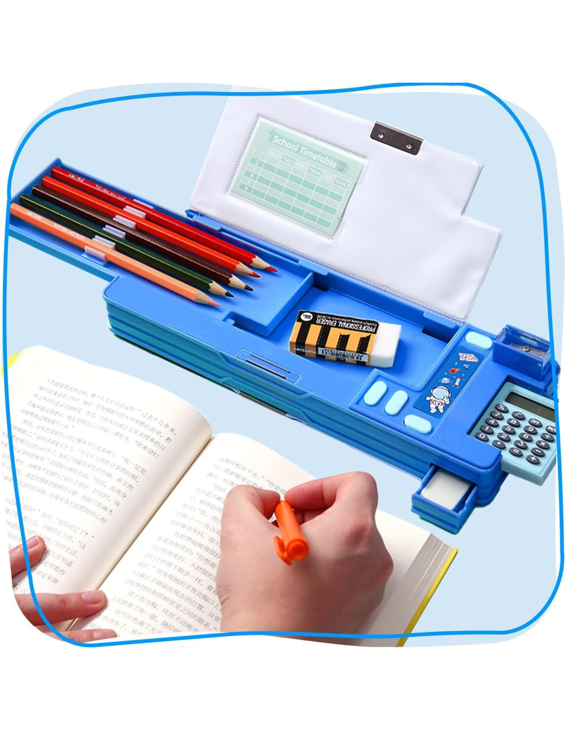 - [Incluye] Nuestro estuche interactivo cuenta con soporte para lápices, sacapuntas, calculadora, pequeños compartimentos, Horario.