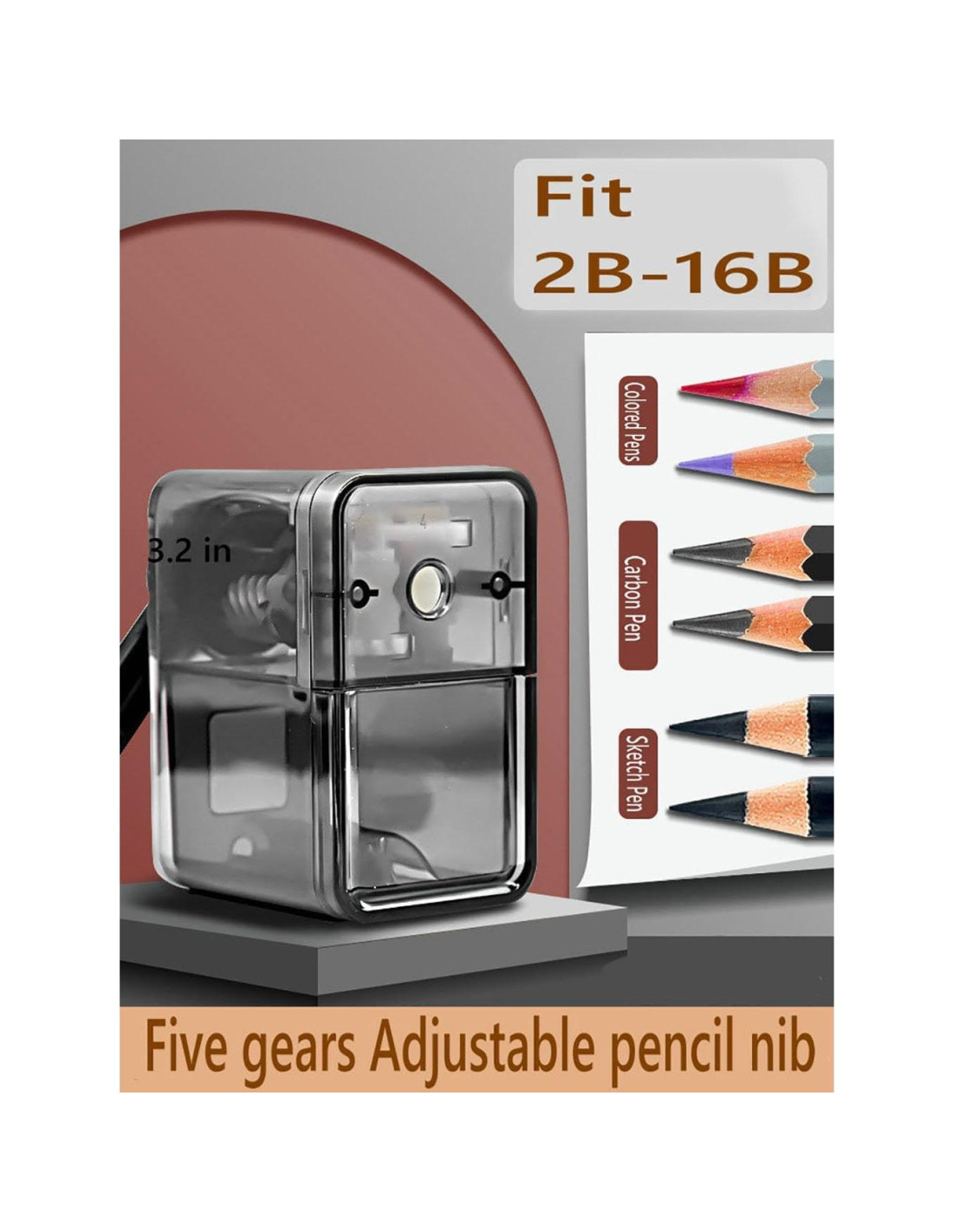 - Sacapuntas ajustable: Punta de lápiz ajustable de cinco engranajes, la versión mejorada del sacapuntas está equipada con un botón en la palanca, que puede eliminar la mina de lápiz rota a tiempo y prevenir el atasco causado por la mina rota. El sacapuntas automático solo requiere que insertes el lápiz, sostengas el sacapuntas y gires la manivela; completará automáticamente el afilado.