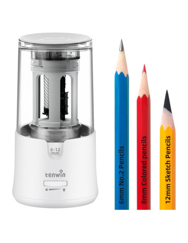Este sacapuntas está diseñado para diferentes formas de lápices de 6-12mm como lápices redondos, triangulares y hexagonales. Cada tiempo de afilado es de 3-5 segundos con toda la fuerza del motor para ahorrar tu tiempo y lápices. Si la mina rota atasca la cuchilla helicoidal, por favor inserta un lápiz duro y presiónalo hacia abajo con 2KG de presión.