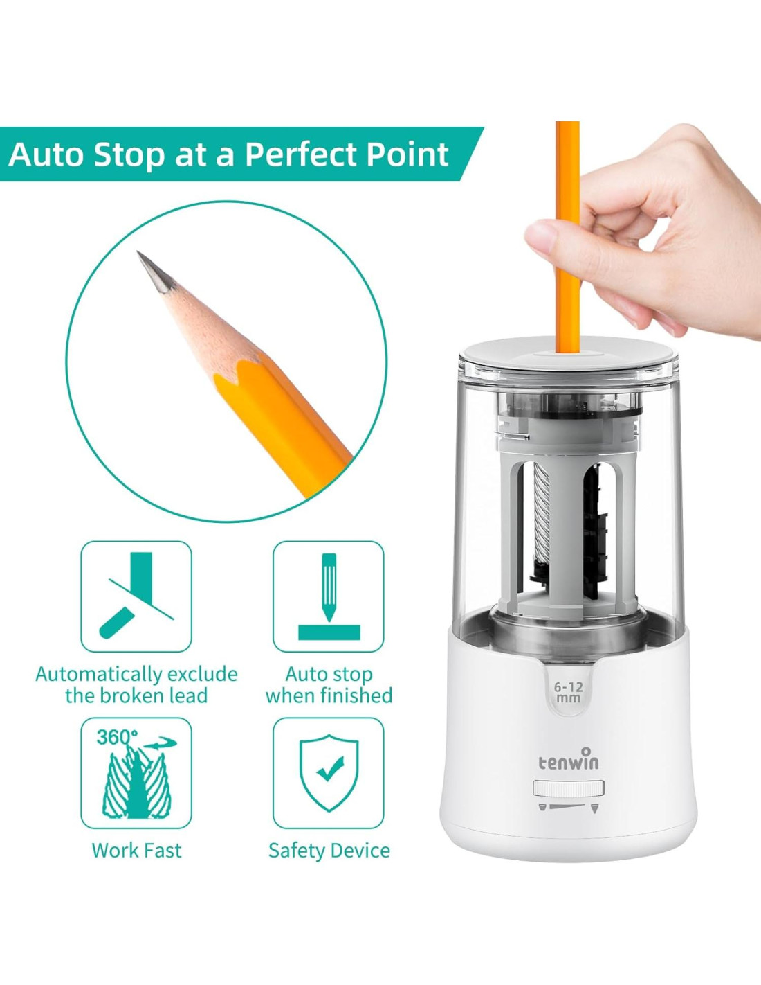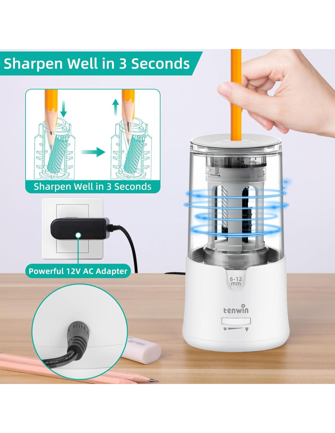 - Sacapuntas Eléctrico Rápido y Afilado Equipado con una cuchilla helicoidal afilada y un motor robusto, nuestro sacapuntas eléctrico puede afilar un lápiz bien en solo 3-5 segundos. Supera el afilado manual, ahorrándote tiempo valioso.