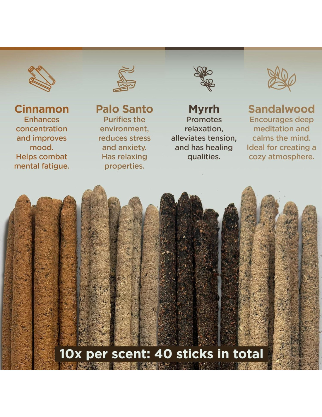 - EXPERIMENTA AROMATERAPIA CALMANTE NATURAL: Deja ir el estrés con el suave y reconfortante aroma de puro Copal Palo Santo, puro Copal Mirra, puro Copal Canela y puro Copal Sándalo. Libre de químicos y fragancias sintéticas, nuestras varitas de incienso te brindan aromaterapia natural que es suave pero poderosa, ideal para calmar la mente, reducir la ansiedad y agregar energía pacífica a cualquier habitación, ya sea en casa o en la oficina.