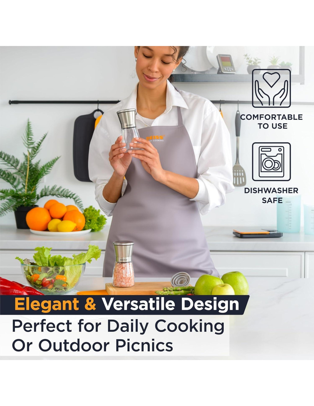 - DISEÑO PRÁCTICO CON CUERPO DURADERO - Este práctico conjunto de molinillos de sal y pimienta está fabricado con materiales de alta calidad. El molinillo de vidrio no solo es resistente, sino que también es libre de BPA, lo que lo hace absolutamente seguro de usar. Los molinillos de sal y pimienta de vidrio de 170 gramos (6 oz) te permiten ver exactamente cuán llenos están, y puedes hacer el relleno de sal y pimienta a tiempo.