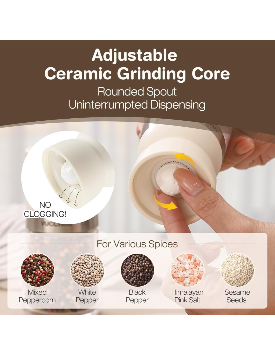 - Molinillo de Cerámica Ajustable, Polvo Más Fino - Este molinillo de sal cuenta con un mecanismo de molienda de cerámica mejorado para una textura más fina y consistente. Su suave y redonda boquilla de vertido previene obstrucciones, asegurando un molido sin esfuerzo y un fácil vertido