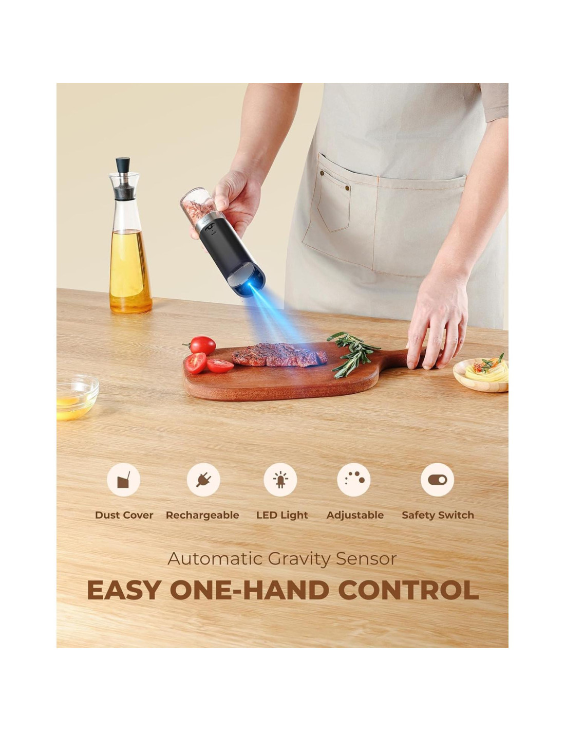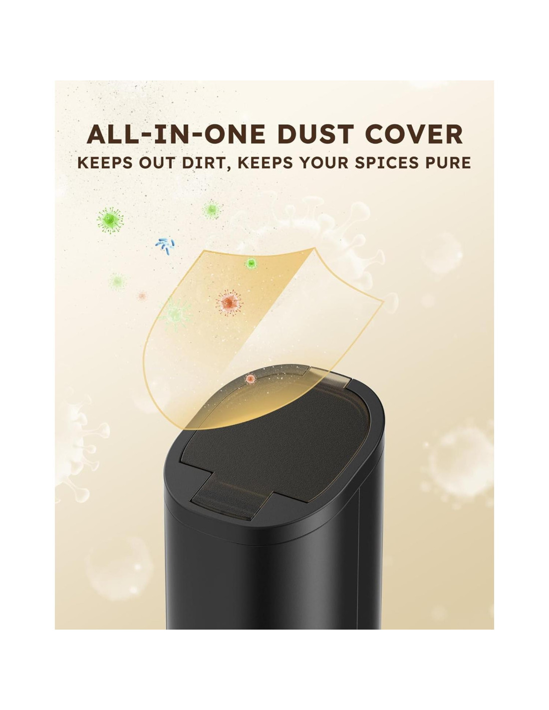- [TAPA ANTIPOLVO DE UNA PIEZA] El juego de molinillos de sal y pimienta a gravedad viene con una tapa antipolvo integrada mejorada. Después de cocinar, simplemente cubre el juego de molinillos eléctricos de sal y pimienta para mantener el polvo y la humedad fuera, asegurando que tu producto se mantenga limpio y seco mientras preserva el sabor fresco de tus especias