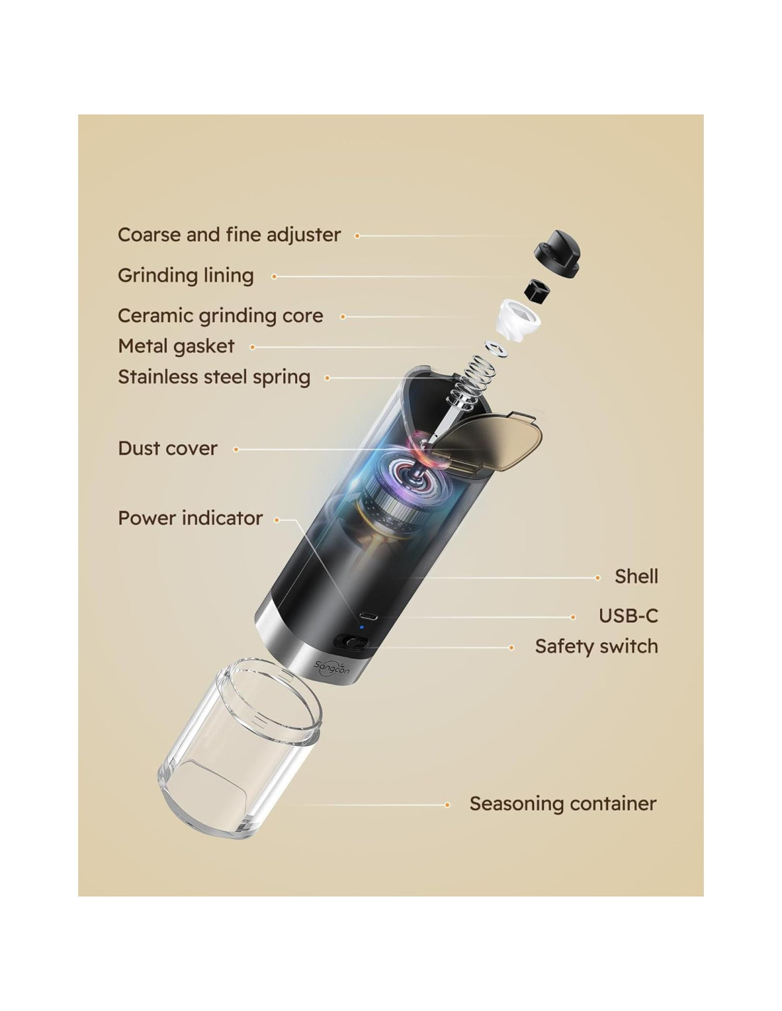 - [GROSOR AJUSTABLE] Los molinos de pimienta Sangcon te permiten ajustar fácilmente el tamaño de la molienda para adaptarse a tus necesidades de cocina. El núcleo de molienda de cerámica es resistente a la corrosión de la sal marina, y el botón de molienda desmontable es fácil de limpiar, previniendo obstrucciones y maximizando la frescura de tus condimentos. Disfruta de una experiencia de cocina más flexible y libre con este versátil juego de molinillos automáticos de sal y pimienta